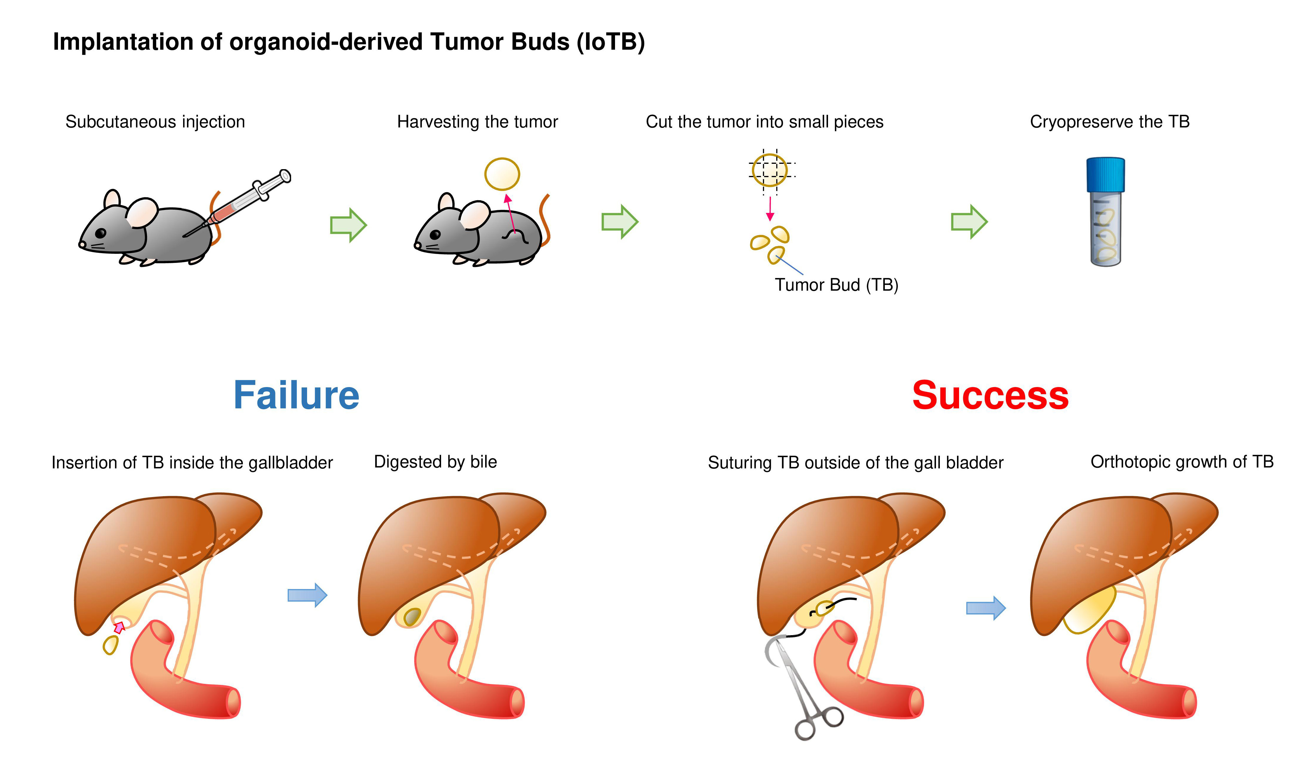 We then tested a two-step implantation approach in which K/53org-derived subcutaneous tumors were orthotopically implanted in syngeneic mice. Tumors were typically minced into 2-mm fragments, which we named “tumor buds (TB)”. Although a TB was initially inserted into the GB with a cut and closed tip, the TB remaining inside the GB did not develop tumors, presumably due to digestion by bile. To avoid direct exposure to bile, we fixed the TB outside the GB by suturing. This method, which we designated as the “implantation of organoid-derived tumor bud (IoTB),” was effective, allowing the transplanted TBs to grow into solid tumors that resembled human GB cancer.