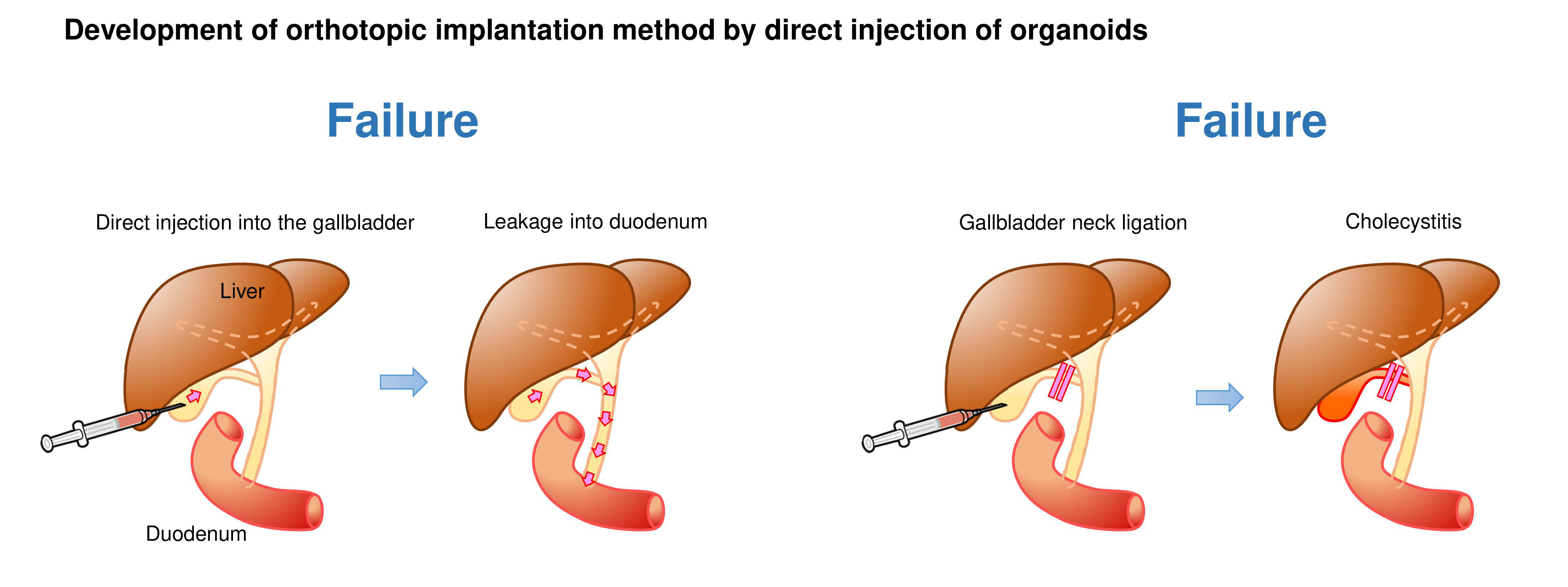 We first generated GB organoids with mutant Kras and Trp53 loss by lentiviral Cre transduction and CRISPR/Cas9 gene editing, respectively (hereafter referred to as K/53org). We aimed to develop orthotopic tumor models via intra-GB injection. However, with K/53org resuspended in Matrigel, injection into the GB lumen of syngeneic mice retained the Matrigel in a liquid state, allowing organoids to readily and freely flow out into the lower bile duct. To avoid such leakage, we ligated the GB neck with a thread prior to injection, which retained the organoids inside the GB. However, all mice eventually died due to stenosis-induced lethal cholecystitis. Subsequently, we ceded the development of an orthotopic GB cancer model using a single-step implantation approach.