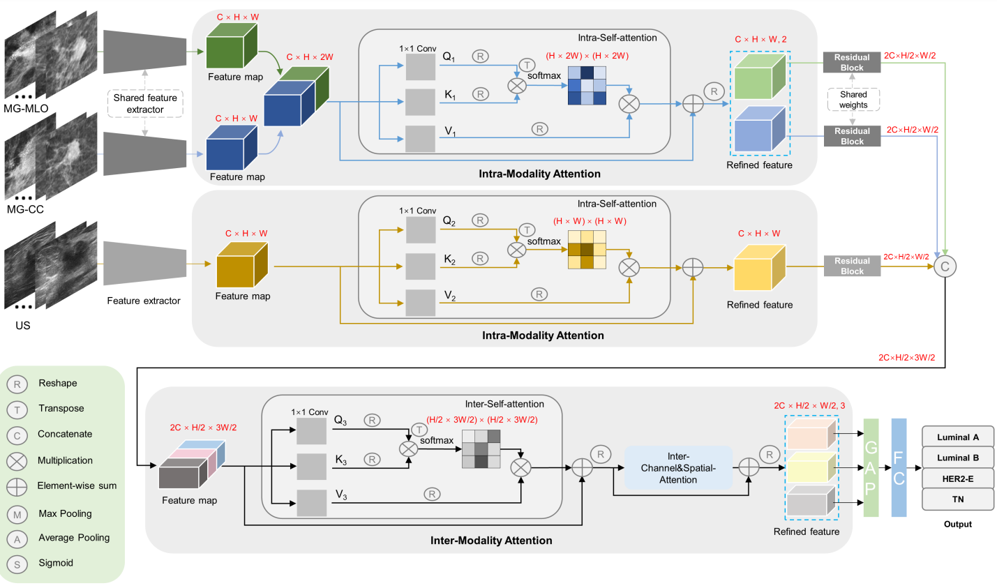 In conclusion, we have developed the MDL-IIA model, which can potentially be used to predict the molecular subtypes and discriminate Luminal disease from Non-Luminal disease of breast cancer, while being a completely non-invasive, cheap and widely available effective method. Beyond molecular-level test, based on gene-level ground truth, our method can bypass the inherent uncertainty from immunohistochemistry test. Multi-modal imaging shows better performance than single-modal imaging, and intra- and inter- modality attention modules are shown to further improve the performance of our multi-modal deep learning model. This supports the idea that combining multi-modal medical imaging may indeed provide relevant imaging biomarkers for predicting therapy response in breast cancer, thereby potentially guiding treatment selection for breast cancer patients.