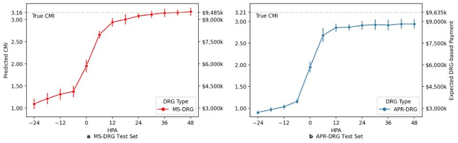 Figure 2. Performance of the NLP model to predict aggregated Case Mix Index for two patient groups, under Medicare Severity (MS)-DRG and All Patient Refined (APR)-DRG, respectively. HPA refers to hours post-admission, where we anchor the origin to ICU admission. We assumed a base payment rate of $6000 for these cohorts of 500 patient stays.