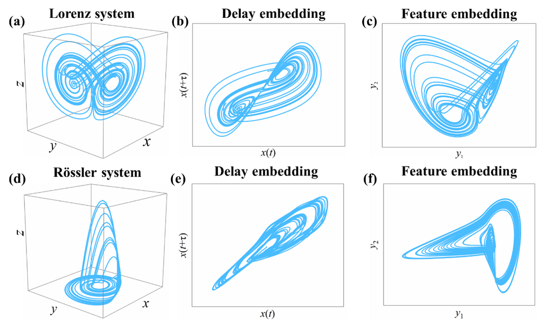 To overcome the aforementioned obstacles, we develop a data-driven predictive framework by a combination of feature embedding (manifold learning) and delay embedding. Our framework yields reliable predictions for all components via a generalized and practical predictor, i.e., the system’s low-dimensional representation from manifold learning. The theoretical foundation of our framework is based on the ground truth that high-dimensional systems often contain redundant information and that their essential dynamics or structures can be characterized by low-dimensional representations, e.g., the meaningful structure of a 4096-dimensional image (64 pixels by 64 pixels) can be characterized in a three-dimensional manifold with two pose variables and an azimuthal lighting angle. These low-dimensional representations can be sufficiently identified from two powerful techniques: feature embedding and delay embedding. To understand this, we consider the 3-dimensional Lorenz system and the 3-dimensional Rössler system, they show quite different structures in state space (Figure 2(a) and (d). From delay embedding, we can find their 2-dimensional representations, which show similar topological structures with original systems (Figure 2(b) and (e)). From manifold learning, we can also find their low-dimensional representations (Figure 2 (c) and (f)). Notice that all the information on low-dimensional representation from feature embedding can be obtained, while some elements are unknown on the low-dimensional representation from delay embedding. Since low-dimensional representations (in different coordinates) from the two approaches show isomorphic structures with the original system. This enables us to find the unknown elements on the representations from delay embedding by one-to-one mapping between two low-dimensional representations. Additionally, in a dynamical system, each time series variable can reconstruct a low-dimensional representation via delay embedding. Therefore, the low-dimensional representation from feature embedding can be practically selected as a generalized predictor to potentially identify the future dynamics of all components in complex systems. The substantial potential of our framework is shown for both representative models and real-world data involving Indian monsoon, electroencephalogram (EEG) signals, foreign exchange market, and traffic speed in Los Angeles Country. Our framework overcomes the curse of dimensionality and finds a generalized predictor, and thus has potential for applications in many other real-world systems.