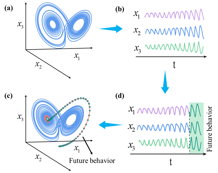 We live in a complicated world that consists of various complex subsystems, like the financial system, climate system, and ecological system, to name a few. Hopefully, we all want to understand the future behaviors of the complex systems around us, and then guide decision-making. However, it is challenging and sometimes unavailable to directly find the rules and achieve ahead predictions in many real-world complex systems. Fortunately, various datasets of components in complex systems are accessible, in particular, time series data, collected from temporal evolutions of real-world observations, are considered to contain rich information of complex systems, e.g., species population series are used to estimate the stability of ecosystems, and temperature series are useful indicators in climate systems. Finding the future behaviors of systems components can be helpful for the predictions of complex systems. To understand this, we consider the classic Lorenz system that consists of variables , and (Figure 1(a)). Each component outputs a time series (Figure 1(b)) as the Lorenz system evolves in state space. If we can predict the future behaviors of all these variables (Figure 1(c)), it is likely to estimate the future behaviors of the Lorenz system (Figure 1(d)).