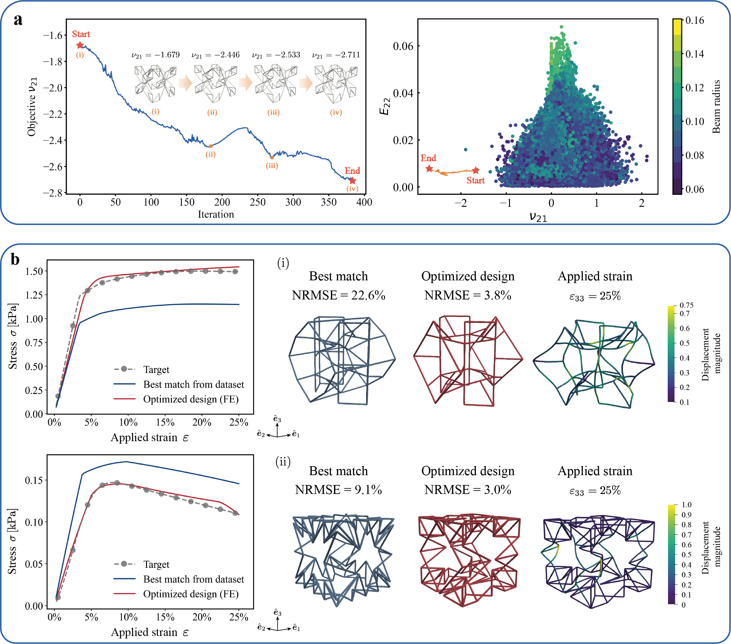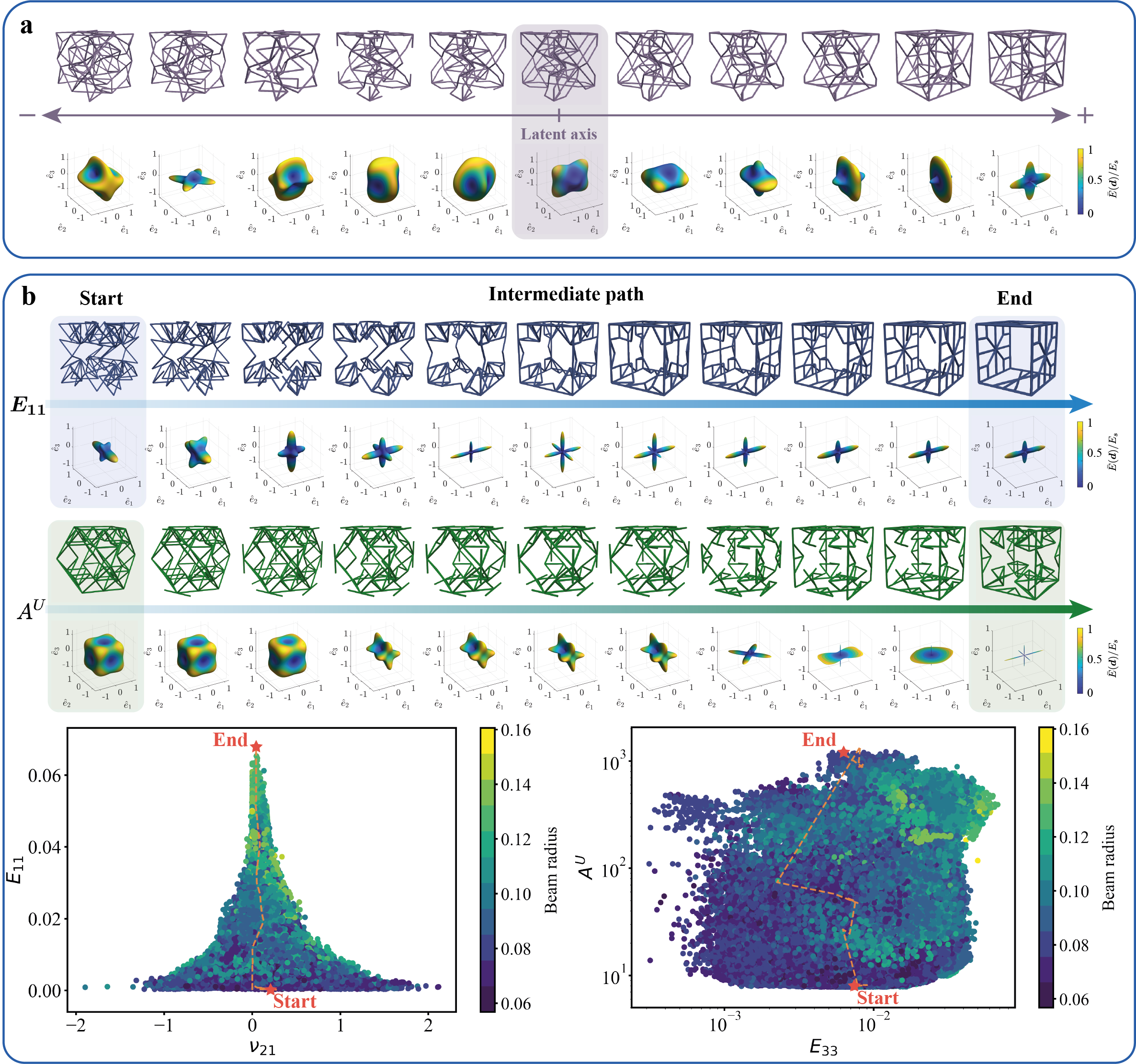 The continuous, low-dimensional latent space serves as a robust representation, capturing the intricate relationships between structural features. Unlike simplistic memorization of training data, this constructed latent representation understands the underlying physics, enabling precise tailoring of truss behaviors by gradient-based optimization. This not only facilitates achieving desired properties but also enables extrapolation beyond the training data, broadening the scope of potential solutions.