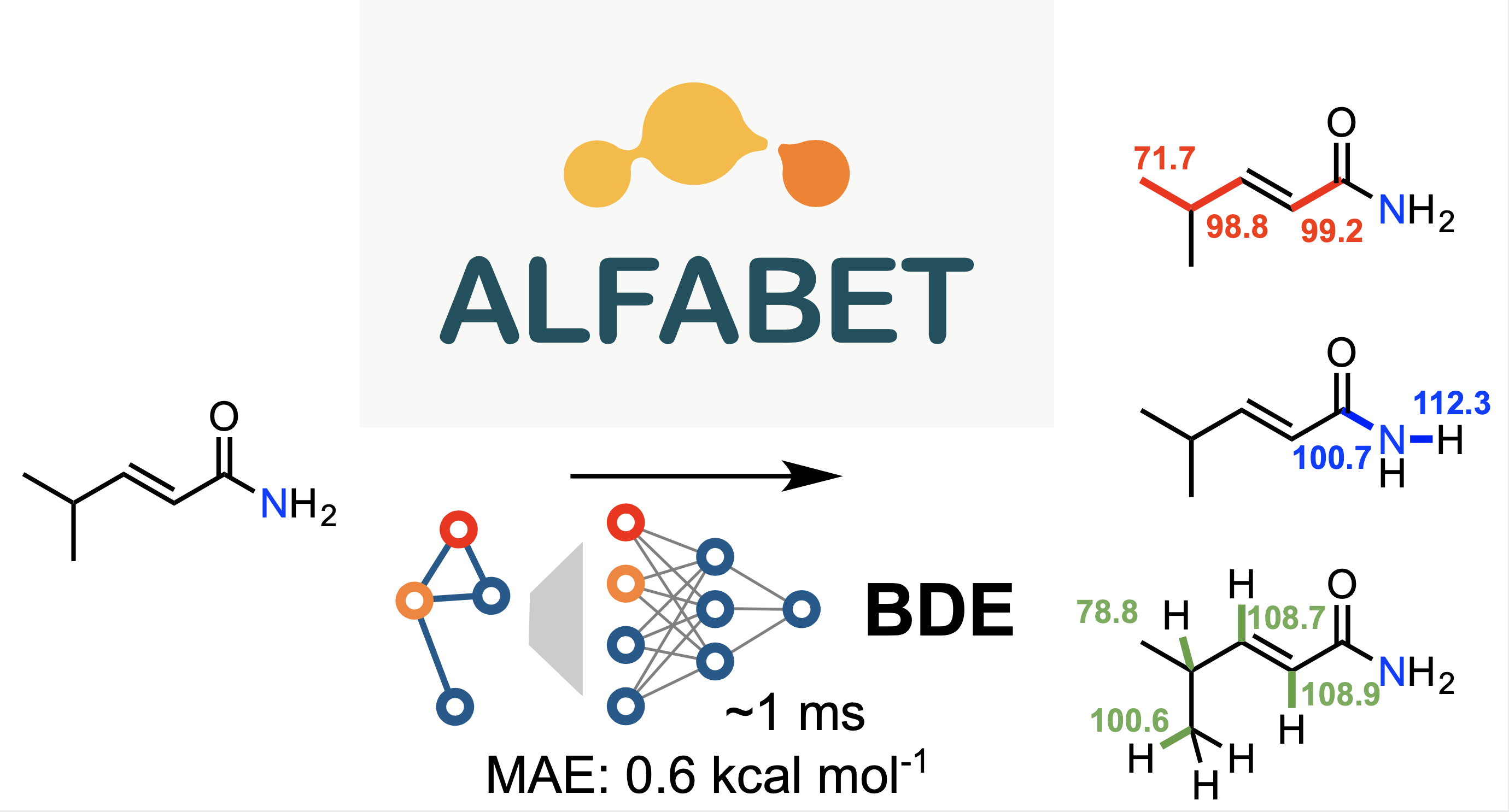 For this paper, a collaboration between Peter St. John, Seonah Kim and Yeonjoon Kim at NREL and Yanfei Guan and Robert Paton at Colorado State University, we trained a graph convolutional neural network against nearly 300,000 organic bond dissociation enthalpies. The resulting model, a machine-Learning derived, Fast, Accurate Bond dissociation Enthalpy Tool (ALFABET) predicts BDE values that are comparable to density functional theory in much less than a second. The predictions can be run on the web: https://bde.ml.nrel.gov/