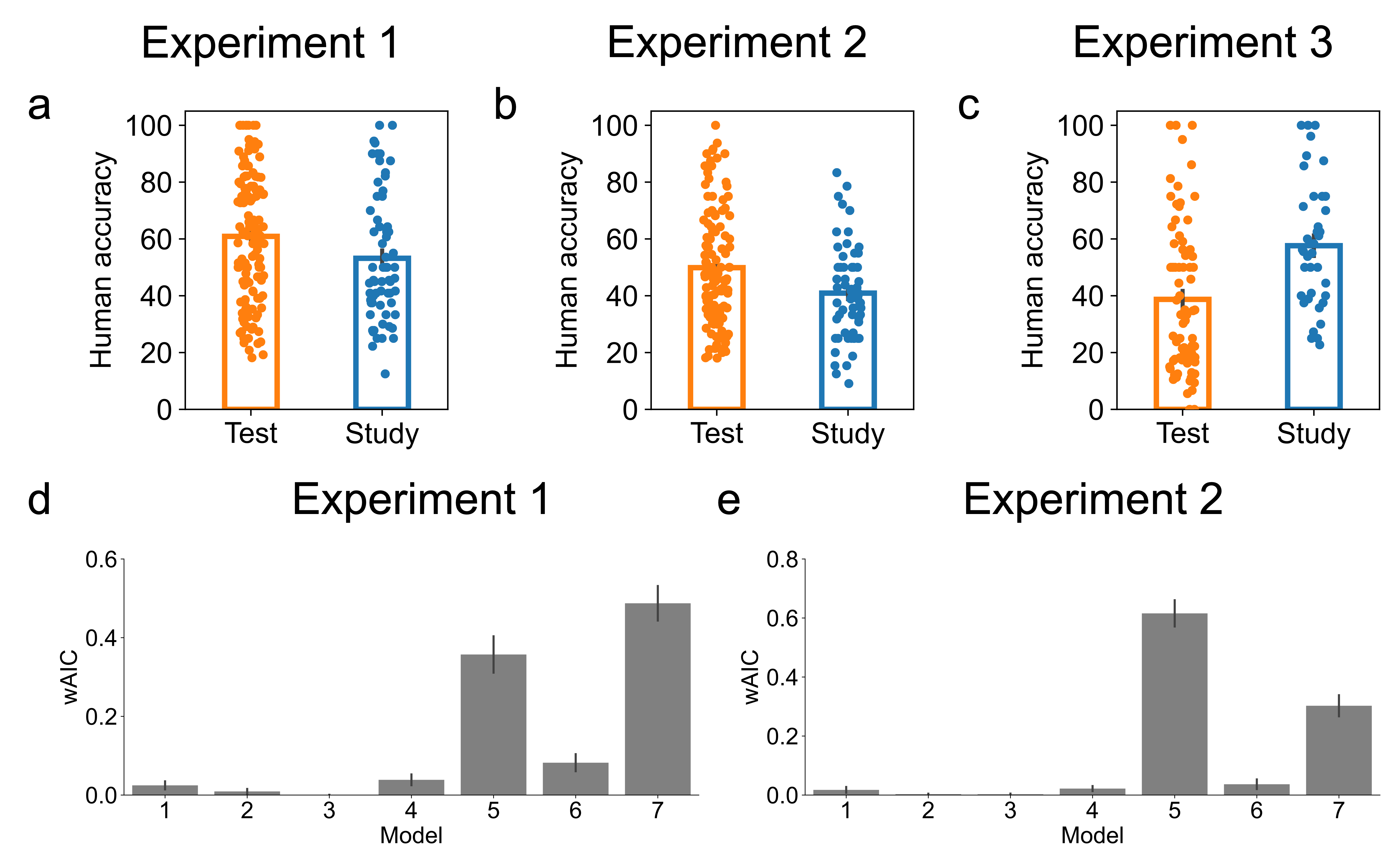 Figure 1 | Behavioral patterns and model comparison. a-c. The testing effect is significant when feedback is incorporated in test (Experiment 1 and 2) but is absent when feedback is absent. d-e. the model with predictive learning (Model 5) fit the human data largely better than model with Hebbian learning (Model 4). Model 7 incorporates both predictive and Hebbian learning. See the details of different models in our paper.