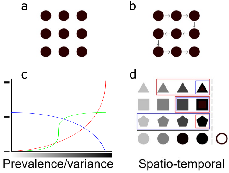 Figure 1 Modeling approaches for a river system: prevalence/variance vs spatio-temporal. a-b) Sites are treated as independent for the prevalence/variance approach; dependence between sites is taken into account for the spatio-temporal analysis. c) The prevalence/variance method looks at variations in microbial community composition along gradients. The various curves represent different taxa shifting in abundance along a gradient. d) The spatio-temporal method uses bacterial taxa abundances in various transformations taking into account the spatio-temporal dependency between sites in order to predict downstream ecological outcomes. Pictogram transparency represents distance and time gradients across sampling sites.