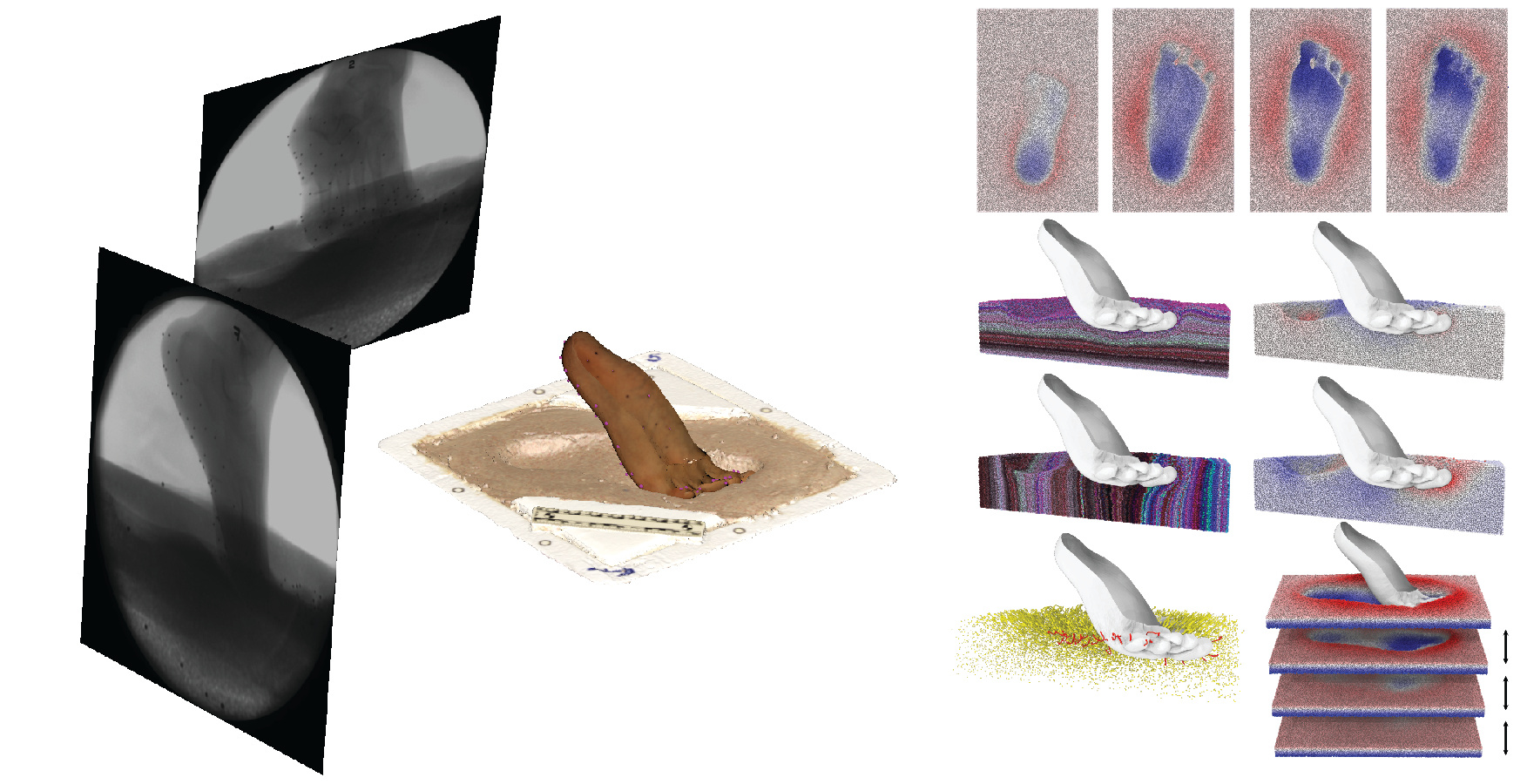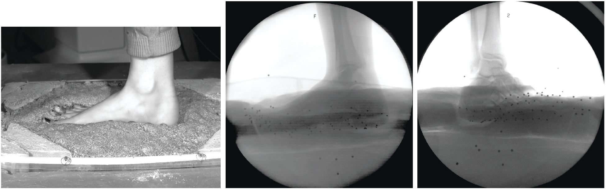 In our new paper in Nature Ecology & Evolution, we applied this approach to study how longitudinally-arched human footprints form. We ran biplanar X-ray experiments in which we acquired 3-D scans people’s feet and placed tiny lead beads on their outsides, such that we could track the motions of the beads in X-ray recordings (Fig. 2). People walked across rigid carbon fiber but also through a variety of custom-made artificial muds that allowed X-rays to easily pass through them (the water and mineral content of normal muds do not allow X-rays to easily pass through). We used specialized software to derive 3-D animations of each person’s 3-D foot models moving and deforming in direct accordance with the motions of the lead beads we could see in biplanar X-ray videos.