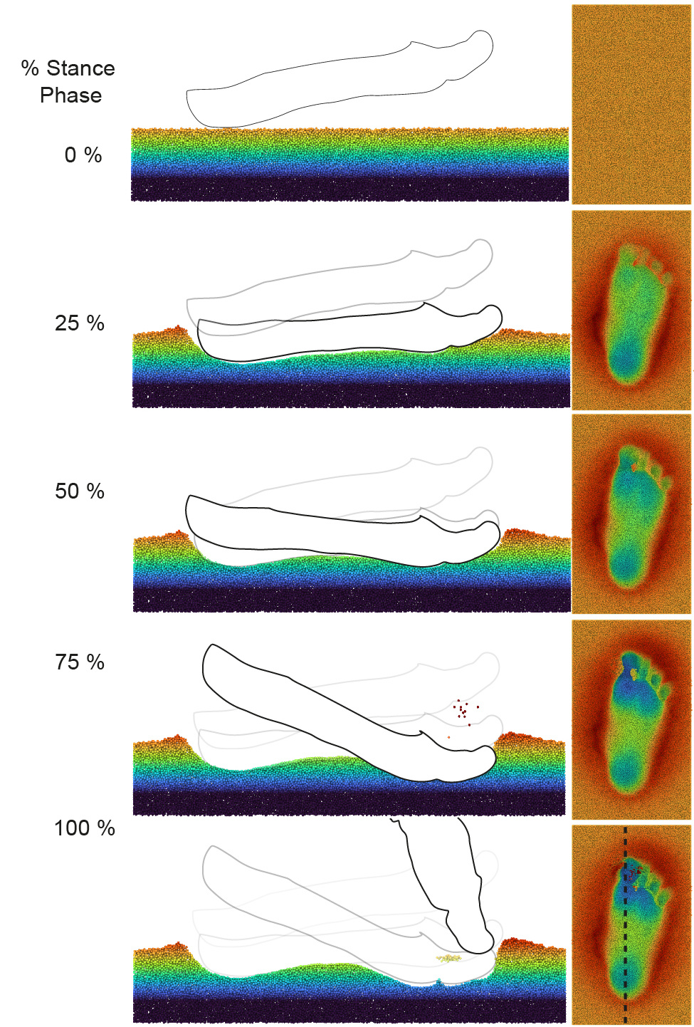 Using new virtual tools that we developed for measuring the arches of feet and footprints, we observed that footprint morphology not a good match for the anatomy of the sole of the foot, especially in deeper muds (akin to the substrates in which the Laetoli and Ileret footprints are preserved). Regardless of their arch anatomies, people produced highly arched footprints in deep muds. This negative result was, however, accompanied by an exciting positive one – when we looked “inside” substrates using particle simulations, we realized that arched footprints instead record very important signals of foot kinematics. Specifically, longitudinally-arched footprints are directly generated by the heel-sole-toe rollover pattern that is fundamental to human bipedal walking (Fig. 3).