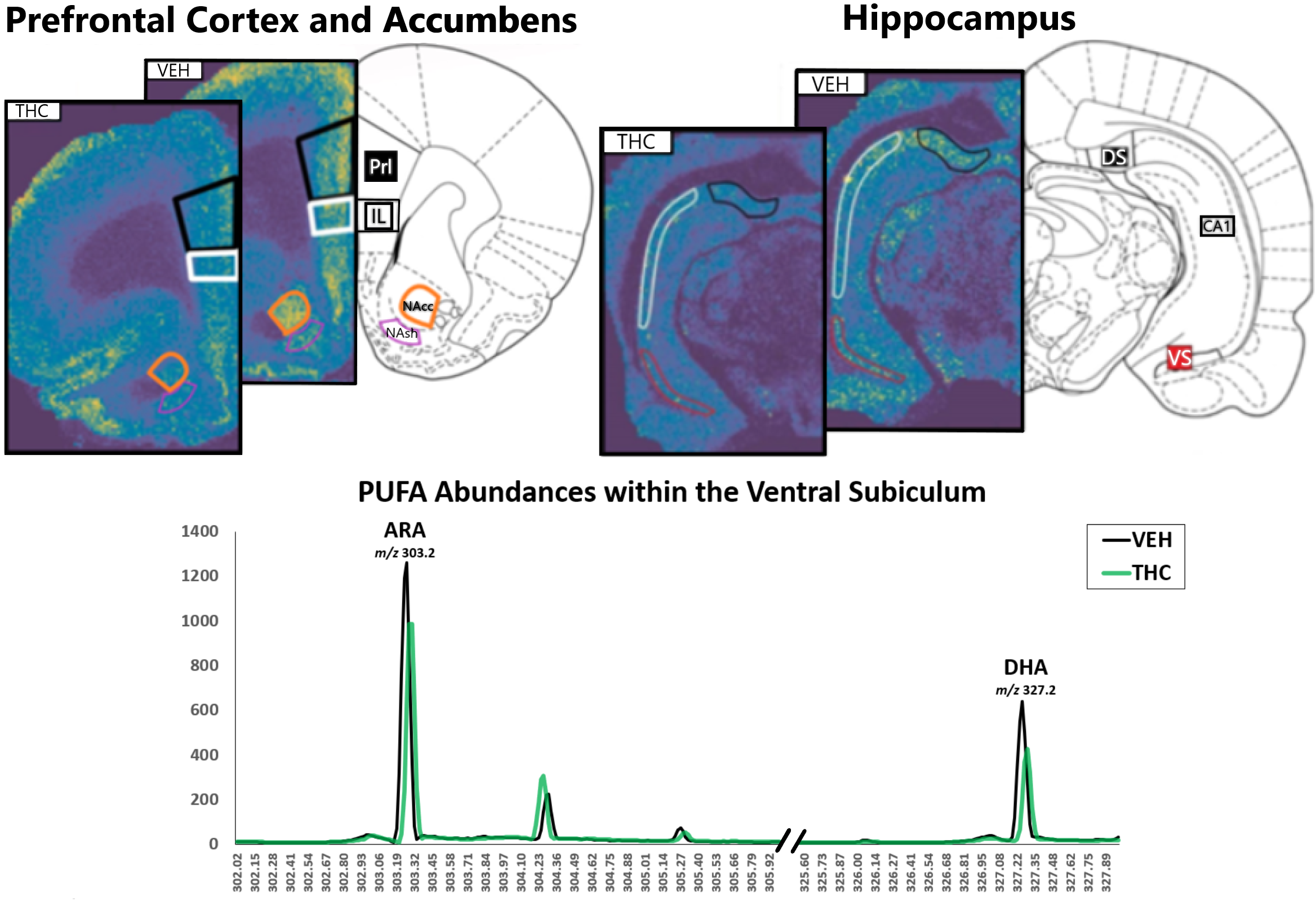 Fig. 1. MADLI-IMS reveals prenatal THC induces cortical lipidome disturbances. VEH vs. THC for DHA in PFC (Prl and Il), NAc (NAcc and NAsh [14]), and hippocampal formation (VS, DS, and CA1).