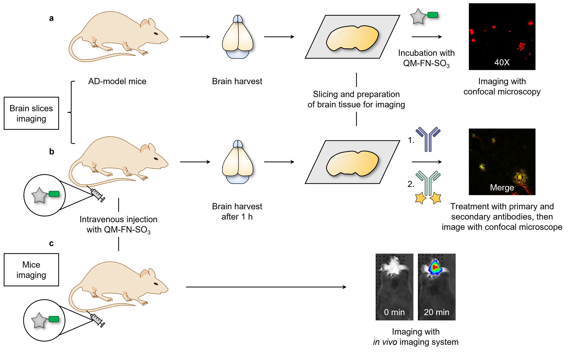 By using the probe QM-FN-SO3, all data acquisition and analyses for in vivo lighting-up Aβ plaques in AD animals can be completed within 1 h, and require only a basic knowledge of spectroscopy and chemistry. It is noteworthy that QM-FN-SO3 is now commercially available as a near-infrared (NIR) BioTracker for AD in J&K Scientific Co. Ltd (https://www.jkchemical.com/product/2959021).