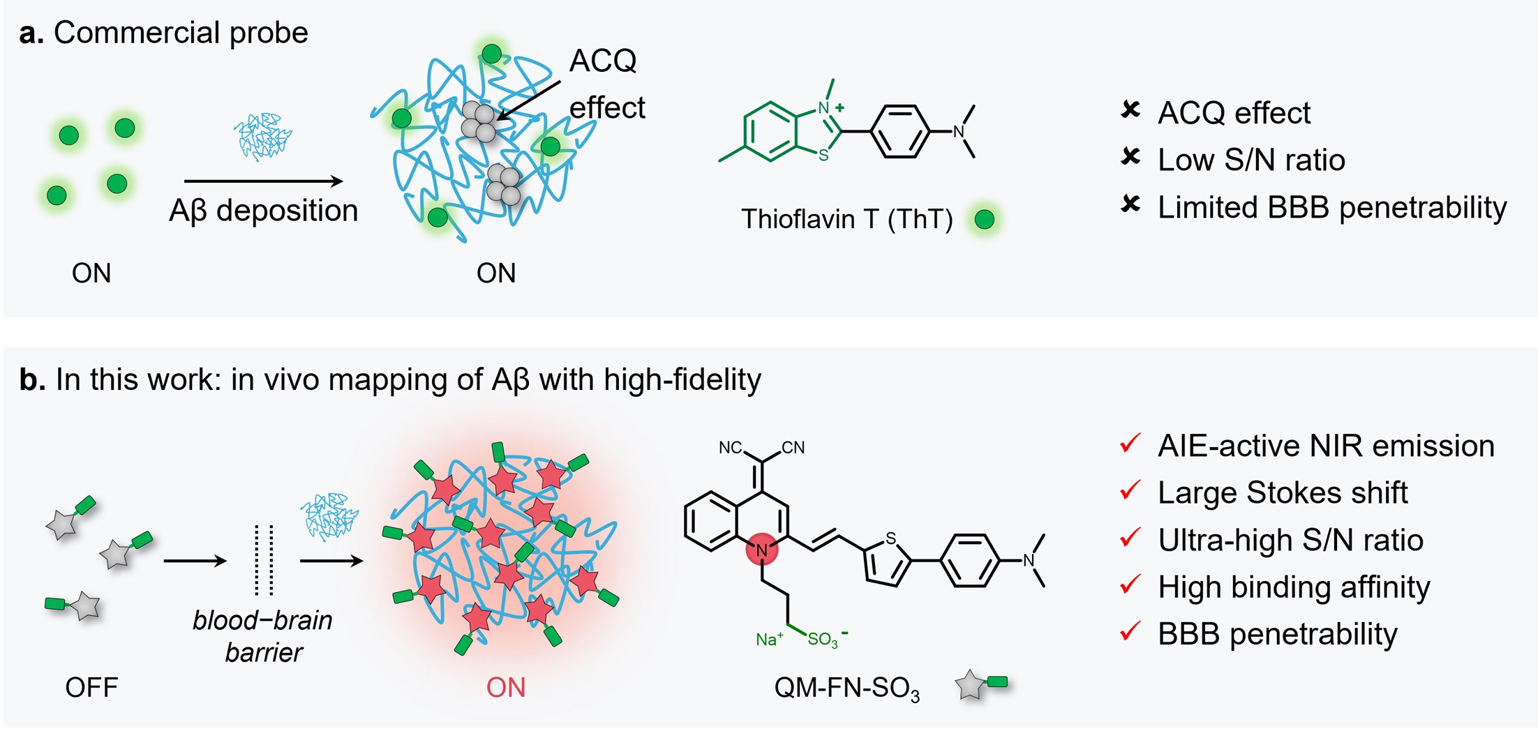Fig. 1 | Comparison of QM-FN-SO3 with extensively used ThT for sensing Aβ aggregates. a Commercial fluorescent probe ThT (the gold standard for detection of Aβ aggregates): unable to sense Aβ plaques in living animals (ACQ effect, low S/N ratio, and limited BBB penetrability). b Probe QM-FN-SO3 from this protocol: near-infrared aggregation-induced-emission (AIE)-active probe enables in vivo and in situ ultra-sensitively lighting-up Aβ plaques.