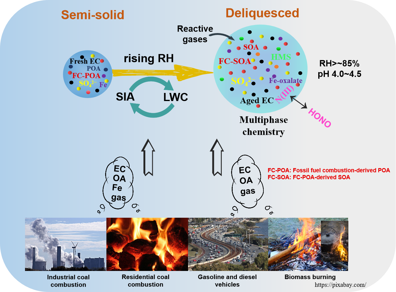 The wintertime haze episode often occurs with high yields of sulfate and secondary organic aerosols (SOAs) in China, although the air quality improves a lot benefited from the strict implementation of “China Blue Air Actions”. The underestimation of observed high sulfate and SOA by current air quality models is exacerbated with increasing aerosol liquid water content (LWC), suggesting the presence of unidentified aqueous-phase processes involving aerosol water that dominate the formation of secondary aerosols. Several studies have demonstrated significant catalytic role of Element Caron (EC) in the conversion of SO2 to sulfate and highlighted a substantial contribution of fossil fuel-derived carbon to aqueous-phase SOA. Those findings imply a crucial involvement of fossil fuel combustion in the high production of wintertime sulfate and SOA. However, further evidence is still required to elucidate the underlying chemical processes and driving factors.