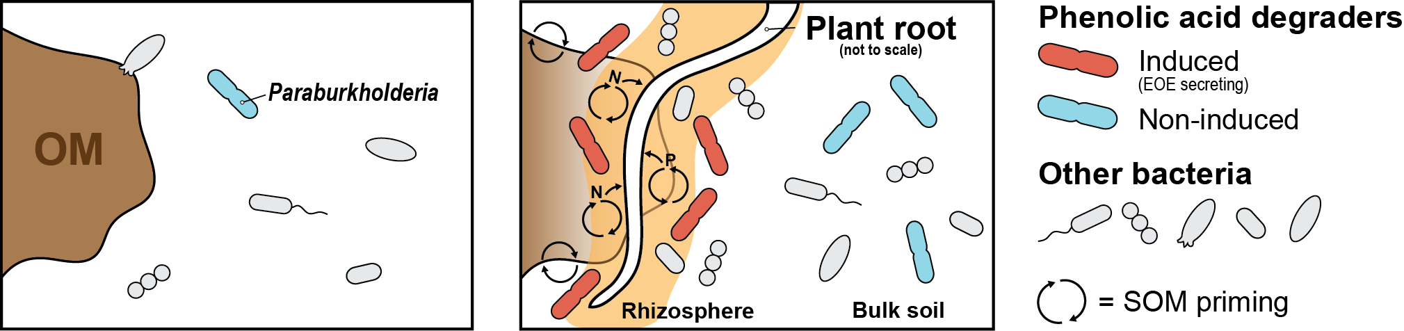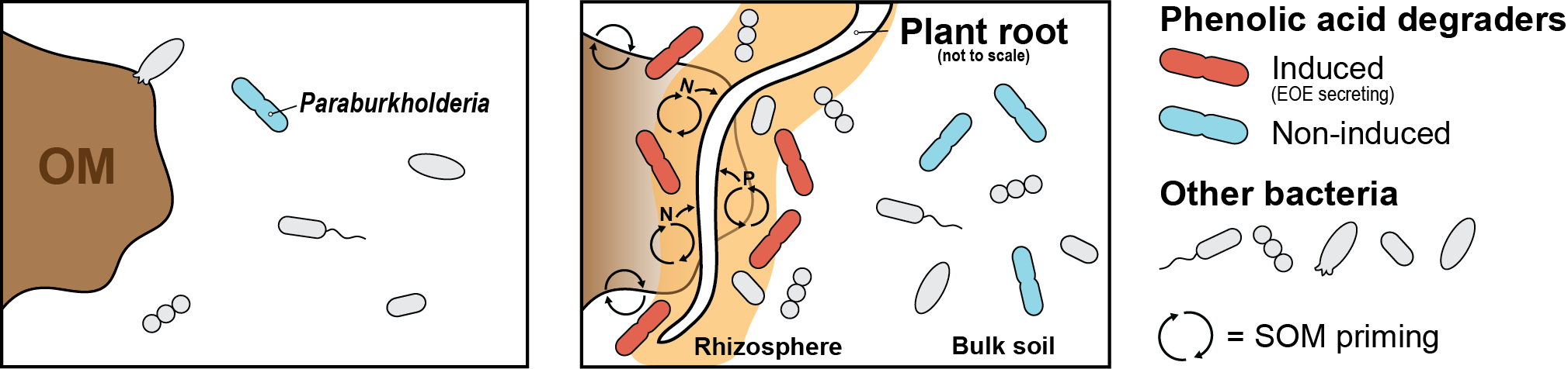 One of our most interesting observations relates to their potential partnership with plant roots. Our study was conducted in a long-term experimental forest, a common garden experiment with different tree species. We observed that the highest phenolic-degrading activity was associated with sugar maple, which had densely matted roots, and coincided with lower-than-average soil carbon stores. In contrast, soils in black locust plantations, a leguminous tree that can form nodules containing Paraburkholderia, had far fewer roots and higher levels of soil carbon. From this, we hypothesized that soil priming by roots can be driven by the exudation of phenolic acids which enhance the activity of Paraburkholderia to degrade soil organic matter, thereby releasing nutrients that promote plant growth (Fig. 3). We suspect that Paraburkholderia form associations with a diversity of plants and that they are key players in regulating soil priming phenomena that influence plant growth dynamics and drive the fate of soil carbon.