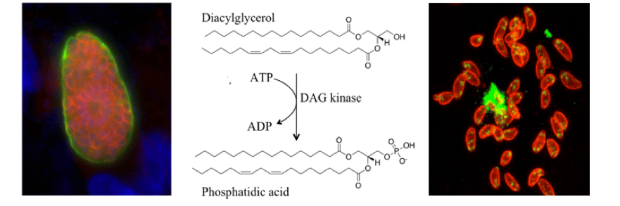 Bisio et al, have unveiled several components of the molecular clock mastering natural egress. Synthesis of phospholipids by T. gondii not only occurs in the cytoplasm but also in the parasitophorous vacuole, an internal space where the parasite grows sheltered from host cell attacks. One particular phospholipid, phosphatidic acid, is produced from diacylglycerol by the action of the diacylglycerol kinase 2, secreted by the parasite in the vacuole. This enzyme accumulates progressively in the vacuole during infection and produces phosphatidic acid which ultimately triggers natural egress (Bisio et al, 2019).