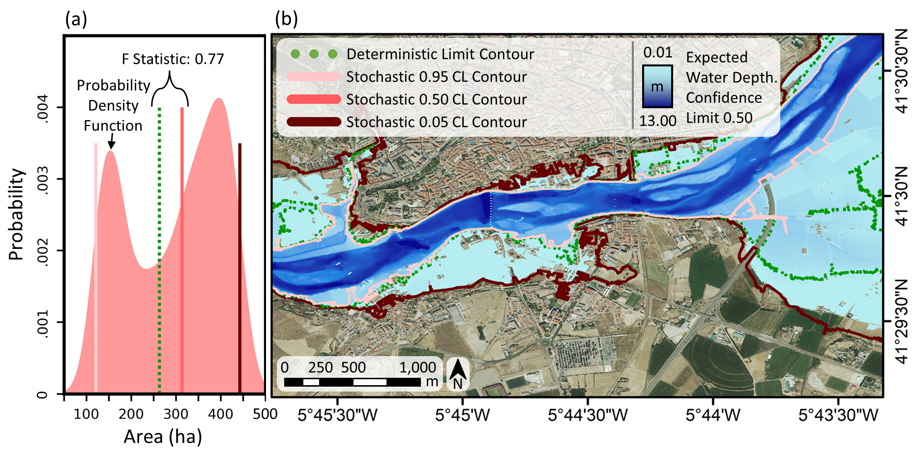 Figure 1. a It displays a graph showing the probability distribution of flooded areas. It includes two peaks and lines representing different levels of flooding and their associated probabilities. The figure compares a deterministic approach (green dashed line) with different levels of stochastic flooding (pale-pink, dark-pink, and dark-red lines). The F-statistic indicates the level of disagreement between deterministic and stochastic flooding at a 0.5 confidence level. b The figure also shows the 500-year flood area at a 0.5 confidence level, as well as the limits of deterministic and stochastic flooding at 0.95.