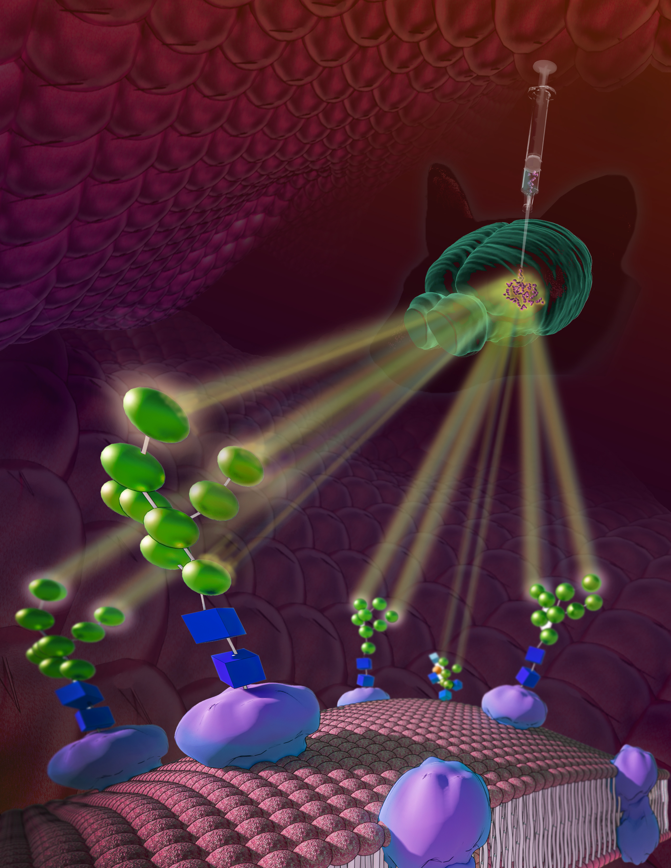Figure 1: Tracking of unlabelled MSCs by mannose-weighted chemical exchange saturation transfer magnetic resonance imaging (MANw CEST MRI). Unlike most other cells, high-mannose N-linked glycans are abundant on the MSC cell membrane. The hydroxyl groups on mannose residues (green) can be selectively manipulated with an off-resonance frequency saturation pulse, which changes the MRI water proton signal of the transplanted cells. Image courtesy of co-author Shreyas Kuddannaya.