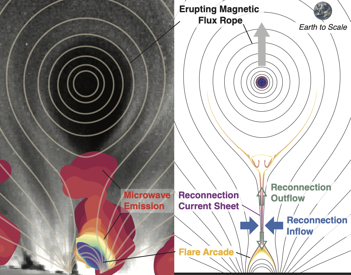 With the help of our techniques for analyzing spatially-resolved microwave spectral data (see our recent Science paper by Fleishman et al.), we were able to derive the magnetic field strength at different locations along the current sheet. Some intriguing features immediately emerged from the measured magnetic field profile: the field strength showed a local minimum above the top of the flare arcade, above which there was another local maximum. What are these peculiar features? In searching for answers, a recent paper by Forbes et al. caught my eye. This was an update of the (arguably) most well-known analytical eruptive flare model by Lin & Forbes. The magnetic field profile of the current sheet in their model showed a similar local maximum feature, which coincided with the primary location of magnetic reconnection in the current sheet where antiparallel field lines break and reconfigure themselves, known as the reconnection “X” point. This was truly my “aha” moment! Working with my colleagues Drs. Chengcai Shen and Kathy Reeves at the Center for Astrophysics | Harvard-Smithsonian, we later reproduced the observed magnetic field profile in the analytical model as well as in a state-of-the-art numerical simulation. We could finally claim that we had measured the magnetic properties of the flare’s central engine!
