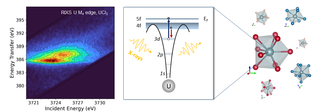 These advanced experimental techniques were found to be not only highly sensitive in detecting the UIII oxidation state (by looking at the shift of the main spectral feature), but also capable of providing detailed information about the electronic structure around the uranium atom. The physical process behind the RIXS method involves the excitation of a core electron by the absorption of an X-ray (see Figure 1). To probe the 5f states, the incoming X-ray energy was selected at the uranium M4-edge (core electron in the 3d3/2), and an X-ray spectrometer allowed us to obtain high-resolution data by recording the fluorescence emitted in a specific decay channel. Using cutting-edge electronic structure calculations, we were able to go one step further and provide insights into the actinide bonding debate. Our study presents a systematic investigation of UIII and UIV halides, namely UX3 and UX4 (X = F, Cl, Br, I), and one of the key questions addressed is the following: how ionic are the bonds in these compounds, and what is the behavior of the 5f electrons?