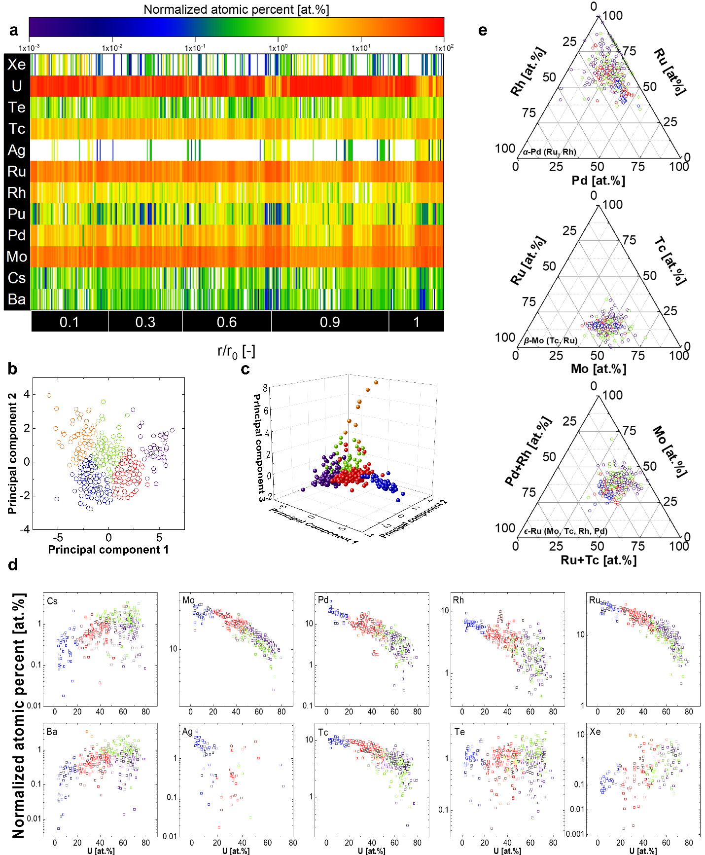 In addition to the qualification of fission products, ML can be applied to quantify the composition of each individual fission-product precipitate. Figure 3a displays the composition of small-scale metallic fission-product precipitates (<100 nm) in the HBS as a heatmap along the radial position of the Limerick fuel segment. The heatmap was calculated from normalized atomic percent (at. %) for Xe, U, Te, Tc, Ag, Ru, Rh, Pu, Pd, Mo, Cs, and Ba with acquired data from STEM-EDS maps. Red indicates high levels of concentration, whereas blue and green indicate low concentration levels. The precipitates primarily consist of Mo, Tc, Ru, Rh, and Pd, with minor Ag contributions; Te, Ba, Cs, and Xe are present in lower concentrations. The phase identification of these fission-product precipitates was not apparent, so clustering analysis was applied on the chemical mapping based on the k-means clustering algorithm. PCA on the elemental concentration determines the sizes of five clusters (blue: cluster 1; red: cluster 2; orange: cluster 3; green: cluster 4; purple: cluster 5) for the k-means clustering method. The two-component (Fig. 3b) and three-component (Fig. 3c) PCA decomposition were plotted by using the k-means clustering method. The relationship between each fission-product element and the U content (at. %) was then plotted, shown in Fig. 3d. The major elements Mo, Tc, Ru, Rh, and Pd indicate a strongly negative correlation to the U content. Figure 3e provides the scatter plot of the ternary phase diagram for each predicted fission-product phase, and individual metallic precipitate compositions were derived from clustering analysis of the STEM-EDS dataset. The α phase diagram distinguishes cluster 1 from the others, showing that it has a higher average Pd percentage. The divergence of the scatter data indicates that the α phase may not be a predominant solid solution path. The β phase diagram indicates a strong concentration of the data, and each grouped cluster is closer in the composition spacing, which indicates that most of the fission products are β phase. The ϵ phase diagram resolved the uncertainty in the α phase diagram, indicating that cluster 1 is closer to the ϵ phase, with a Mo content less than 50 at. %. Cluster 2 partially shows the nature of ϵ phase, with a (Ru + Tc) content higher than 75 at. %. Clusters 4 and 5 may also belong to the ϵ phase, with Mo contents lower than 50 at.%. In all the three phase diagrams, cluster 3 is less prevalent than the other clusters, which reverifies the relationship between the clusters and Xe established by the regression plot in Fig. 3d.