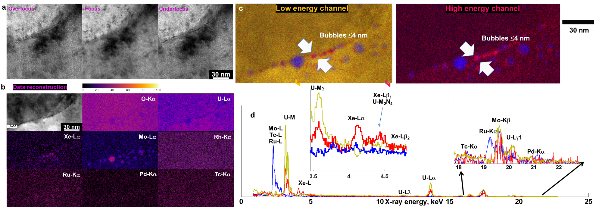 To validate our ML-aided EDS approach, we extended the algorithm to the HBS in the H.B. Robinson fuel with a higher average burnup at approximately 72 MWd kgU−1. Like in the HBS of the Limerick fuel, no intragranular Xe bubbles were observed. However, nanoscale Xe bubbles still exist intergranularly at the grain boundary in the HBS. The advantages gained from using the ML algorithms were validated (Fig. 2), and conventional TEM using the Fresnel contrast method was unable to capture finer features at a random high-angle grain boundary. After the ML reconstruction of the STEM-EDS data, intergranular Xe bubbles overlapping with the fission-product clusters were observed (Fig. 2b). The nanoscale Xe bubbles (≤4 nm) are presented as color mix maps in Fig. 2c, and the spectrum is labeled at low- (0–10 keV) and high-energy (10–20 keV) ranges. The ML decomposition of the X-ray spectrum at the low- and high-energy ranges in Fig. 2d demystifies the fission-product nanoclusters and Xe bubbles trapping at the grain boundary. In the low-energy range below 5 keV, the fission product precipitates are rich in Mo-L peak, and the Tc-L and Ru-L peaks are lower. The Xe bubbles are reflected by the Xe-Lα, accompanied by Xe-Lβ1 overlapped with U-M2N4 and minor Xe-Lβ2. The matrix is dominated by the U-Mγ line. At the high-energy range above 18 keV, a strong Mo-Kβ signal appears, along with Ru-Kα, Tc-Kα, Pd-K, and U-Lγ1 peaks. The spectrum analysis showed that the fission product is the β-Mo (Tc, Ru) phase. In this scenario, the Xe-L line readings are lower than the spectra loadings of fission product precipitate L lines. However, the nanoscale Xe bubbles can be recognized with improved visibility over the conventional BFTEM and STEM methods.