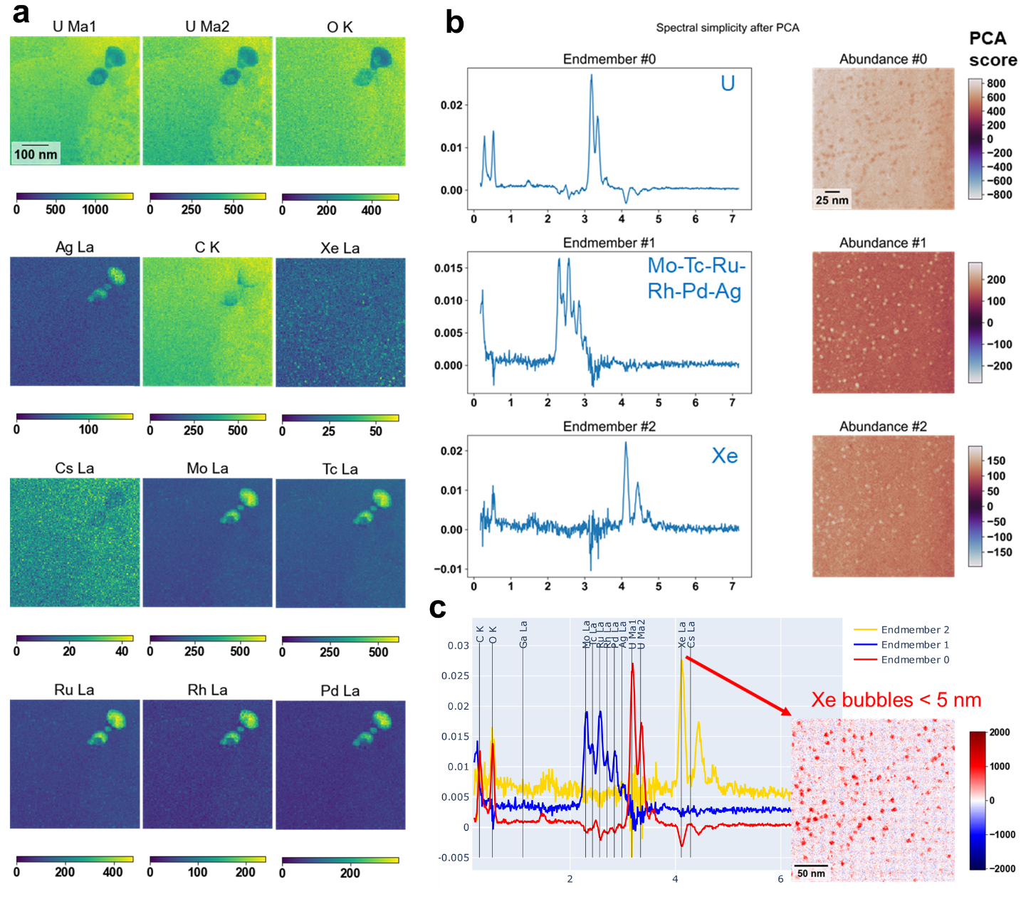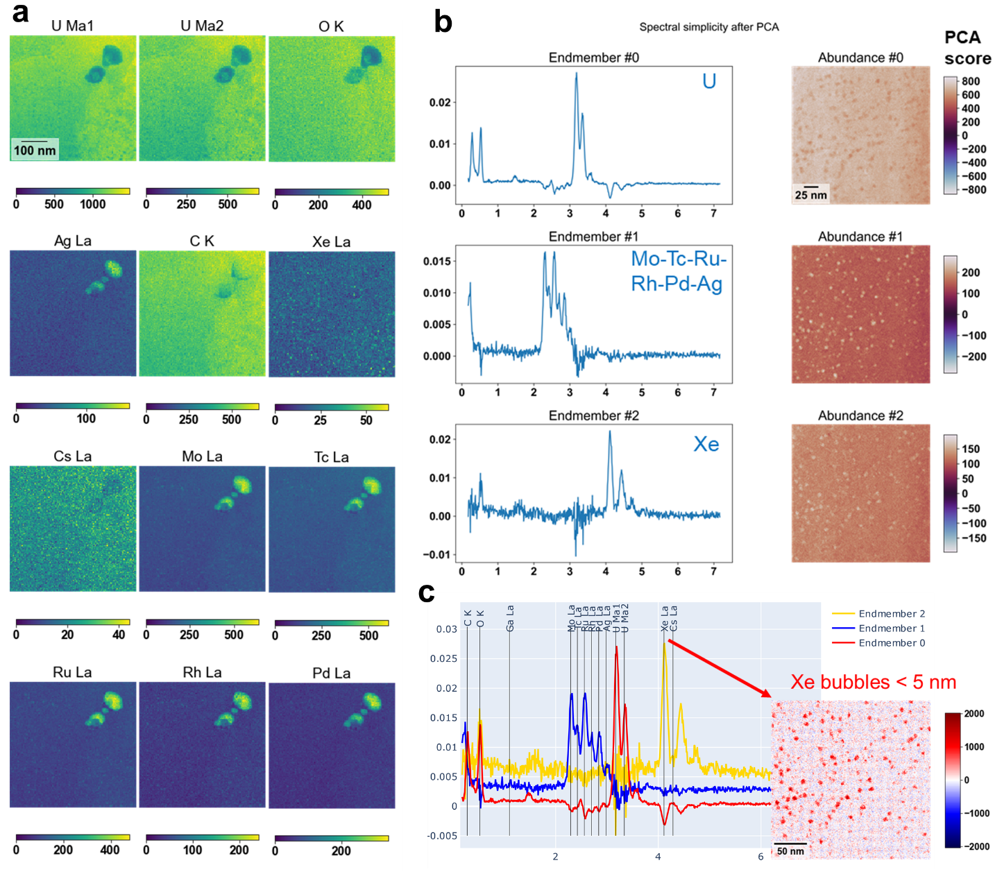 PCA results show both precipitates and Xe bubbles. Detailed X-ray intensity mapping of the Xe (Fig. 1) improves the visibility of fine Xe bubbles, which are invisible when using conventional TEM. Cs and Ba are not prevalent in the matrix. Figure 1b shows a higher magnification deconvolution map (a spectral simplicity–rotated abundance map and a spectral endmember pair) of intragranular Xe bubbles in another restructured grain of the Limerick fuel. In this particular instance, the PCA has been applied to greatly improve the relatively noisy and sparse dataset, into a series of low-rank, low-noise, image, and spectra vectors. Reducing the data into these components vastly improves the visibility of key features. In this instance, the PCA analysis revealed three primary components representing the three strongest spectrum-image pairs within this particular dataset. The three-component analysis revealed overlapping of Xe bubbles with the fission products. Each component was marked as endmember #0–#2, and an abundance map accompanies each endmember. Each X-ray (keV) peak labeled via the multivariate curve resolution-alternating least-squares method allows efficient identification of nanoscale Xe bubbles, and it also displays finer details of fission-product nanoclusters (Fig. 1c). The C–K and O-K lines are weak across the three components. Component 1 shows the U-M lines, which are weaker at the Xe bubbles than the matrix. Component 2 shows the stronger Mo-L and Ru-L signal and weaker Tc, Rh, Pd, and Ag signals, implying the combination of the β-Mo (Tc, Ru) and ϵ-Ru (Mo, Tc, Rh, Pd) phases. Component 3 shows stronger Xe-L lines than the Mo–Tc–Ru–Rh–Pd–Ag peaks. This demonstrates the fission-product nanocluster segregation is associated with nanoscale Xe bubbles. We also examined the HBS; no intragranular Xe bubbles were found. This ML-aided algorithm improves the accuracy and speed of locating fine Xe bubbles smaller than 5 nm.