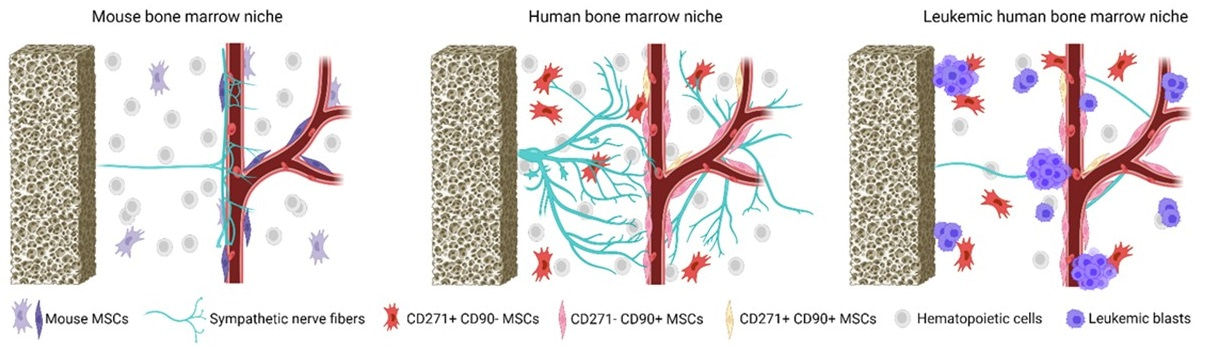 The expansion of leukemic cells is associated with the impairment of normal hematopoiesis that disturbs balanced blood cell production. In addition, recent studies suggested that leukemic cells alter the bone marrow (BM) microenvironment, known as the BM niche, a complex three-dimensional (3D) structure that provides factors necessary for the maintenance, survival, and differentiation of healthy hematopoietic cells [2]. Detailed characterizations of healthy and leukemic BM niches have been primarily conducted in mouse models. Different cell types, including mesenchymal stromal cells (MSCs), endothelial cells, macrophages, lymphocytes, megakaryocytes, and osteoblasts, play an important role in the regulation of hematopoiesis [3]. In addition, sensory and sympathetic nerve fibers (SNF) penetrating the BM were described for the first time in animals more than 50 years ago [4]. The recent development of 3D imaging suggests that the sympathetic nervous system regulates balanced blood cell production [5], cell migration [6], and regeneration of hematopoiesis in response to genotoxic stresses [7] in murine models.