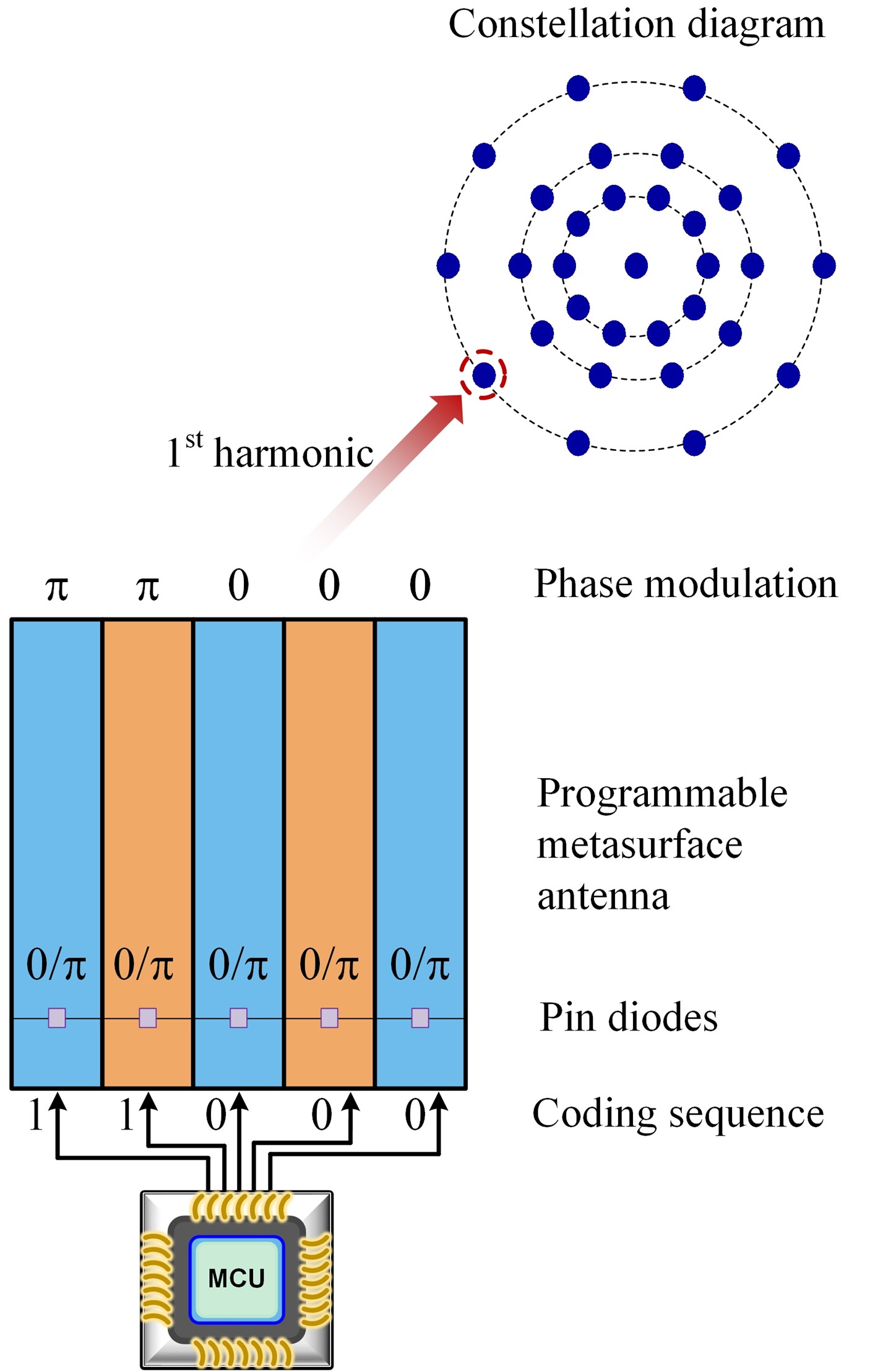 Figure 1. Conceptual illustration of the information mapping model enabled by the programmable metasurface antenna. A 1-bit phase-modulated programmable metasurface antenna is employed, where the number of the operating columns is an odd prime (e.g. p = 5). In the information mapping process, the bit string is modulated by the microcontroller unit (MCU), and 2p-1 encoding states can be distinctly mapped to the first harmonic direction to form a constellation diagram with C2p symmetry.