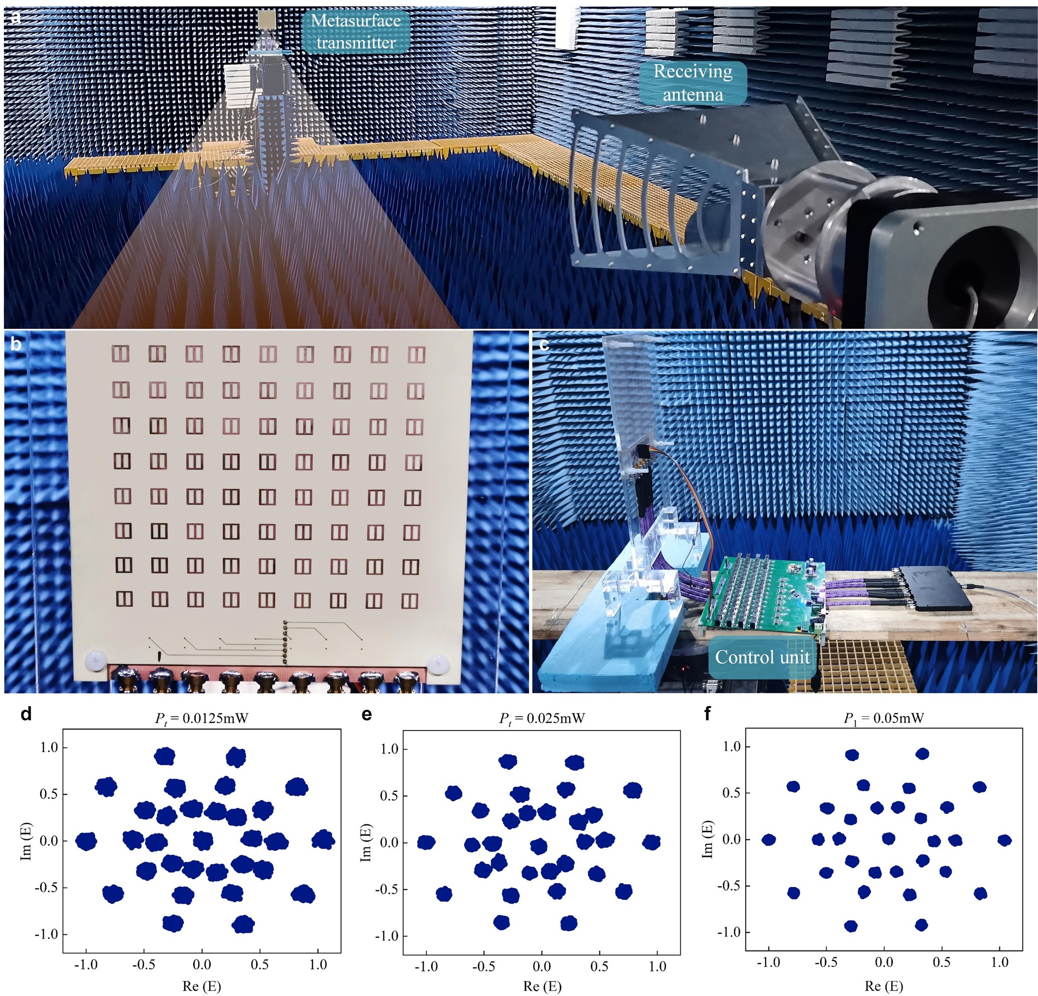Figs. 2a-c illustrate the prototype of the proposed programmable metasurface antenna and the experimental setup. The central five columns of the programmable metasurface antenna serve as radiators, while the outer four columns are configured as dummy elements to establish uniform boundary conditions. By applying different bias voltages to the PIN diodes in each column, the effective length of the feeding line will be changed, resulting in a 180° phase shift in the radiated wave. The designed 1-bit programmable metasurface antenna can generate a total of 25 = 32 distinct coding states. To synthesize the constellation diagram in the direction of the 1st harmonic, multiple far-field measurements were performed for each encoding pattern. The harmonic field responses produced by each encoding pattern were measured by 1000 times, with the input power supplied to the programmable metasurface antenna varying from 0.0125 mw to 0.05 mw, as shown in Figs. 2d-f. Overall, the experimentally retrieved constellation diagrams exhibit great agreement with the theoretically predicted results shown in Fig. 1. Our findings are generally applicable over a wide spectral range and are expected to lay the groundwork for future programmable metasurface enabled high-speed RF-chain-free wireless networks.
