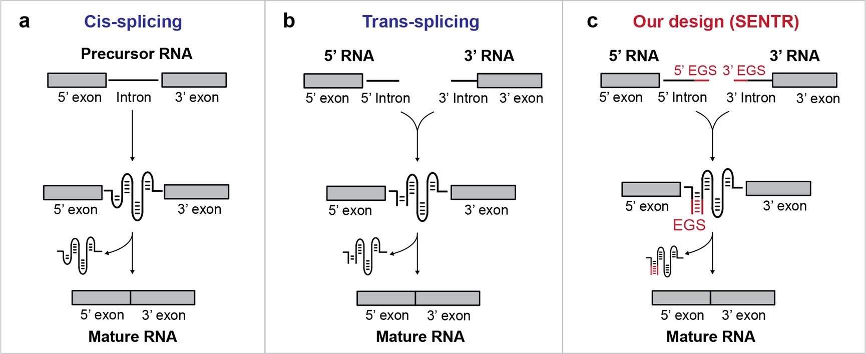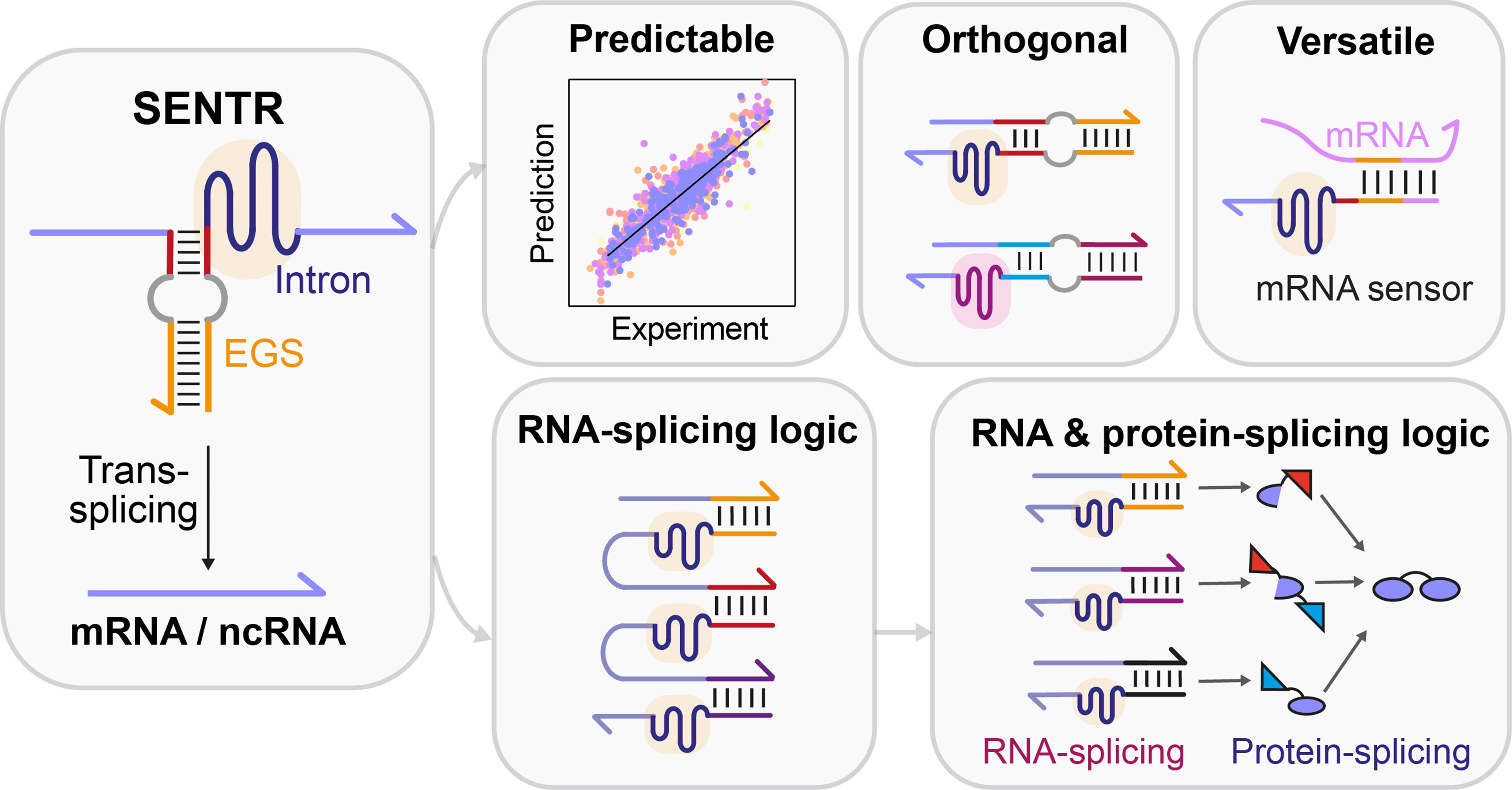 In this study, we developed a novel gene regulatory tool (named 'SENTR') based on split-intron-enabled RNA trans-splicing. We fused a pair of de-novo-designed RNA guides, named EGSs (External Guide Sequences), to the intron halves to regulate the intron assembly and control the trans-splicing activities (Fig. 1c). Therefore, we could alter the trans-splicing activities of a target mRNA by modifying the lengths and sequences of EGSs. We also used machine learning models to predict trans-splicing activities from the EGS sequences. Moreover, we could construct orthogonal RNA splicing pathways (pathways that function independently with each other) by designing EGSs with low sequence similarities.