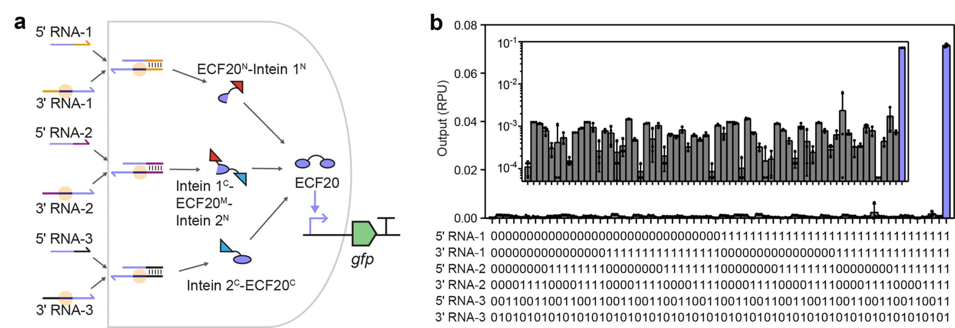 Take the six-input AND gate as an example. The six-input AND gate was constructed by inserting two orthogonal pairs of split intein and three orthogonal pairs of split introns into the ecf20 gene (Fig. 3). Once transcribed, the six input RNAs first underwent three RNA splicing reactions to produce three peptides, splicing into a functional transcription activator ECF20. The ECF20 could then recognize its cognate promoter to trigger the expression of the reporter gene. This six-input AND gate is the most complex AND circuit reported, consuming only one transcription factor. By comparison, the conventional layered design requires ten transcription factors to realize the same function8, meaning that our strategy increased the information processing capacity of a single regulator gene by tenfold.