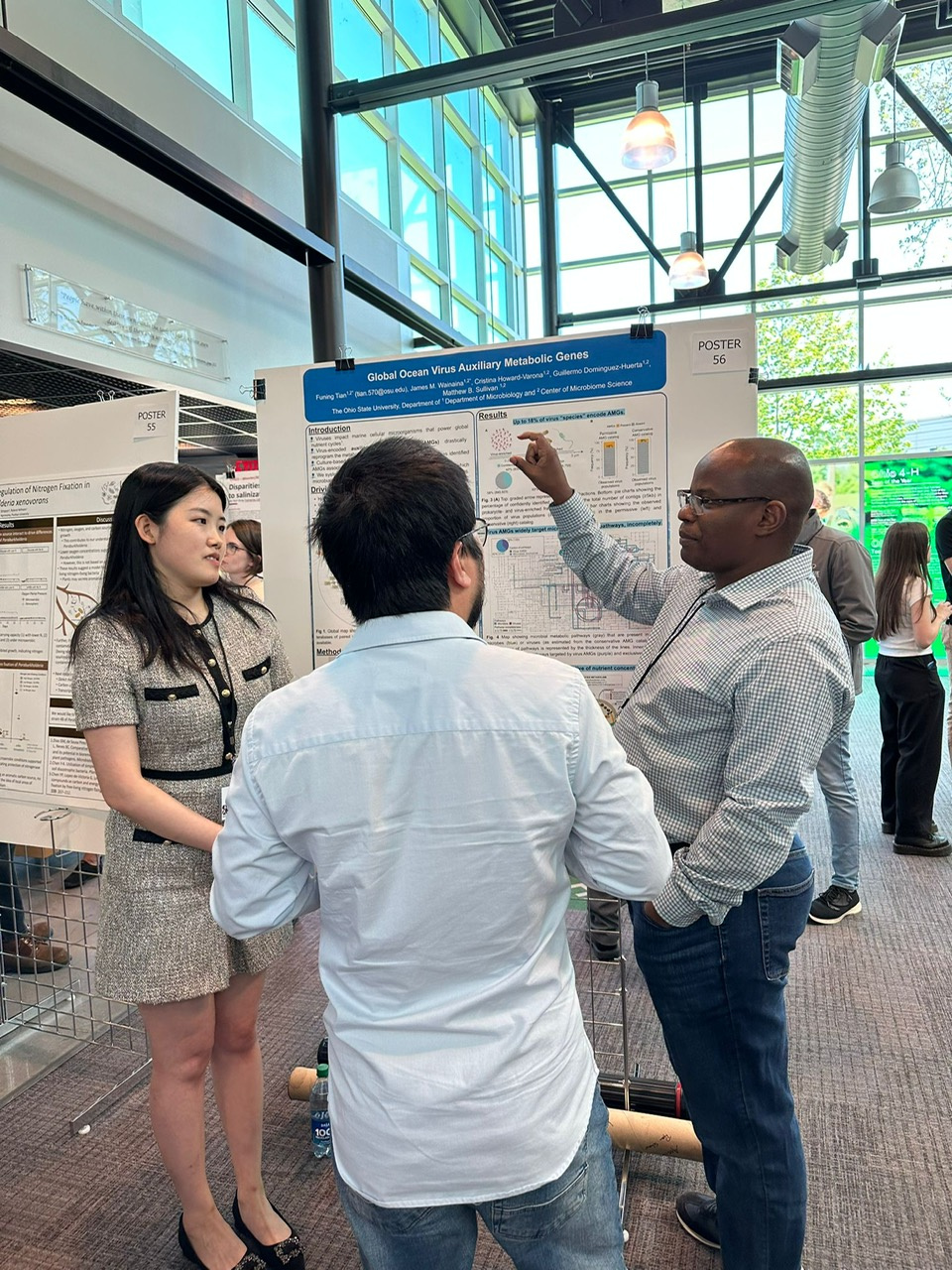 Funing Tian (Left), Zhiping Zhong (Center), and James Wainaina (Right) during a poster presentation of the global AMG catalog work at the Center of Microbiome Science (CoMS) MidWest Conference May 2022