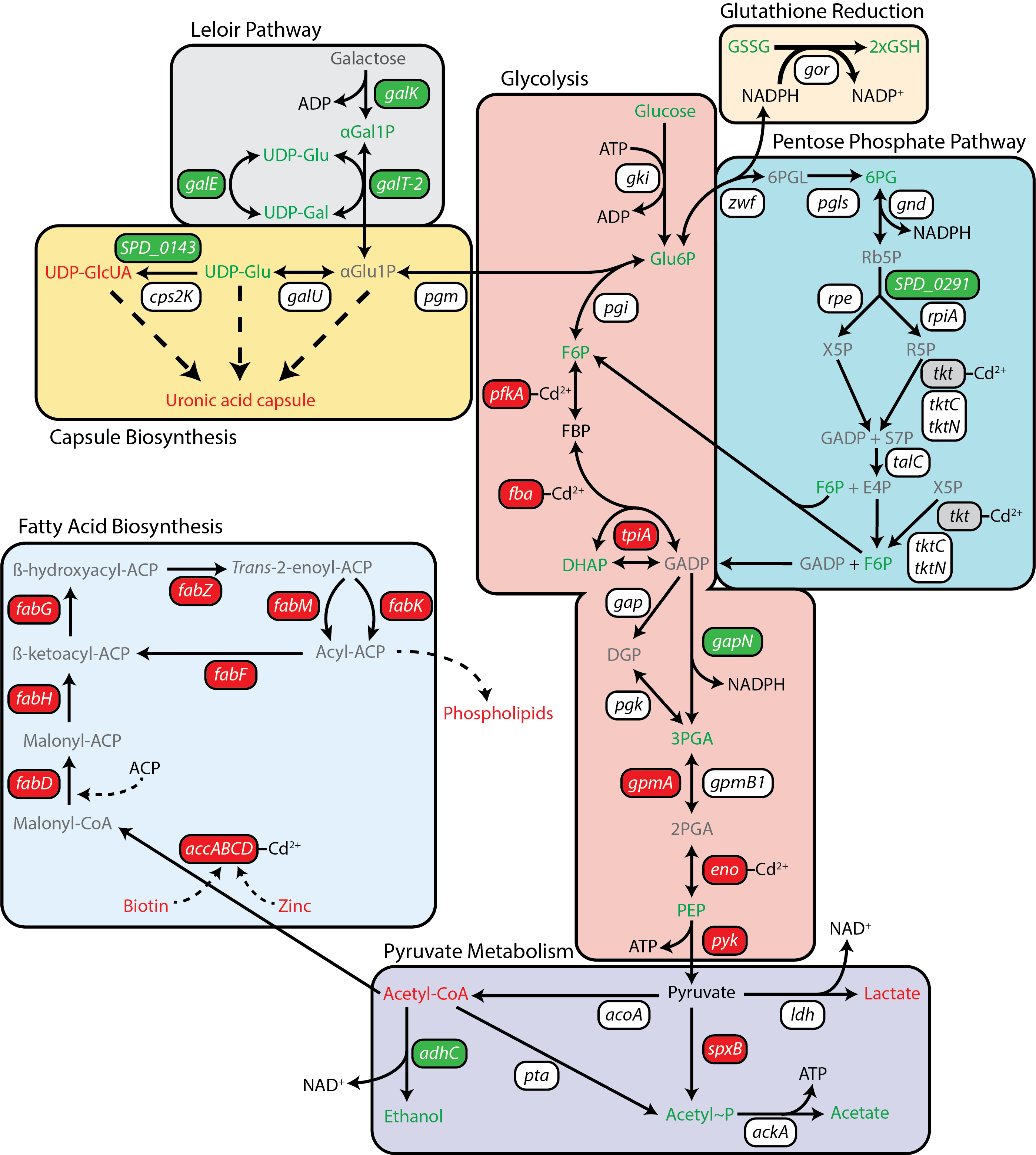 This posed an interesting question – if central carbon metabolism was being impacted by cadmium, how were the cells maintaining viability? We found the answer by looking at carbon source metabolism pathways that were unchanged by cadmium stress. In the pneumococcus, this was the Pentose Phosphate Pathway (PPP). Glucose catabolism via the PPP avoids the early stages of glycolysis, which is heavily reliant on metalloenzymes (Fig. 2). Although the PPP produces less ATP, it primarily relies on metal-independent enzymes, which while slower than their metallated counterparts, were resistant to cadmium inhibition.