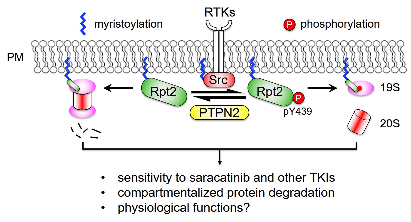 Does this mean that Src/PTPN2 can selectively regulate membrane proteasomes? Indeed, using a membrane-tethered reporter protein and whole-proteome mass spectrometry, we confirmed that Src-mediated Rpt2-Y439 phosphorylation inhibits proteasomal degradation of membrane-associated substrates. On the other hand, cells expressing the unphosphorylatable Rpt2-Y439F mutant show a drastic change in their responses to a Src inhibitor, saracatinib. This translates to a weakened anti-tumor effect of saracatinib when applied to Rpt2-Y439F-expressing lung cancer cells in a mouse xenograft model. Therefore, changing a single pTyr site of the proteasome can desensitize cancer cells to Src inhibition. In this sense, it is tempting to suggest that PTPN2 inactivation (which has been shown to boost immunotherapy against melanoma) may augment the therapeutic effects of Src inhibitors, a plausible combinatorial approach that is worth exploring.