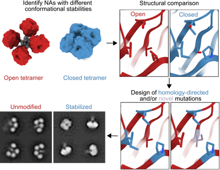 After many designs, we were able to stabilize the closed state of several different NAs from multiple subtypes and confirmed this in precise detail with a cryo-EM single particle reconstruction at 3.2 Å resolution obtained by Ollie Acton in David Veesler’s lab at UW. Further, our stabilized NA proteins (called “sNAps”) showed improved affinity to infection-induced monoclonal antibodies, which further suggested that this closed conformation is more biologically relevant than the open conformation.