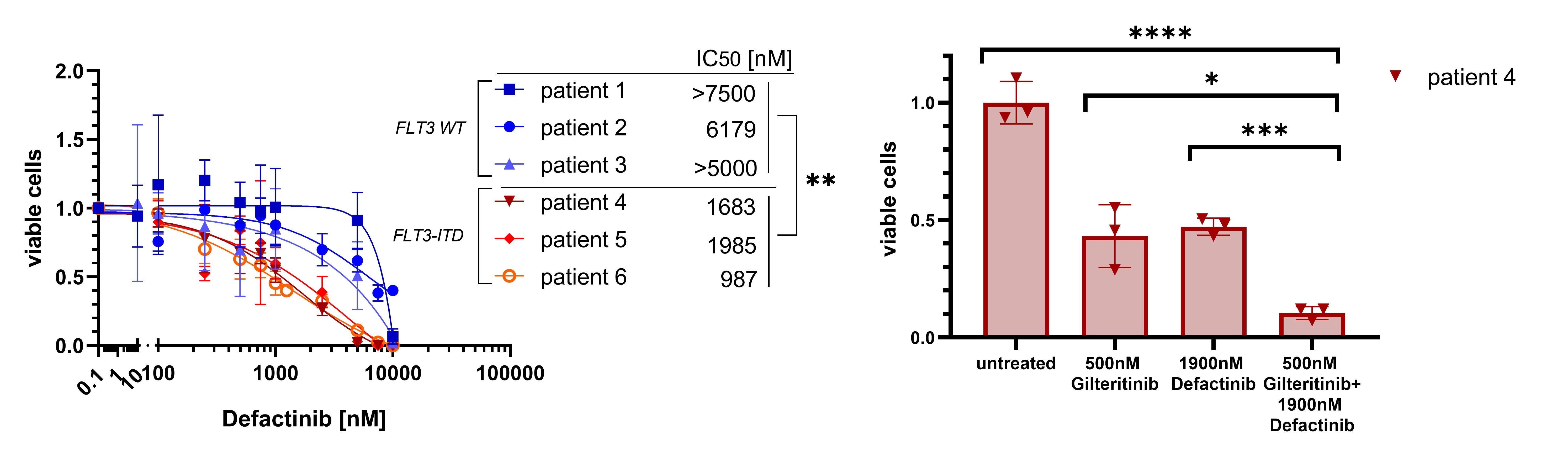 Figure 3: Left: Viability for three FLT3-WT and three FLT3-ITD mutated patient samples treated with defactinib. Defactinib was only effective in FLT3-ITD mutated patient samples. Right: Synergy of gilteritinib and defactinib for an FLT3-ITD mutated patient sample.