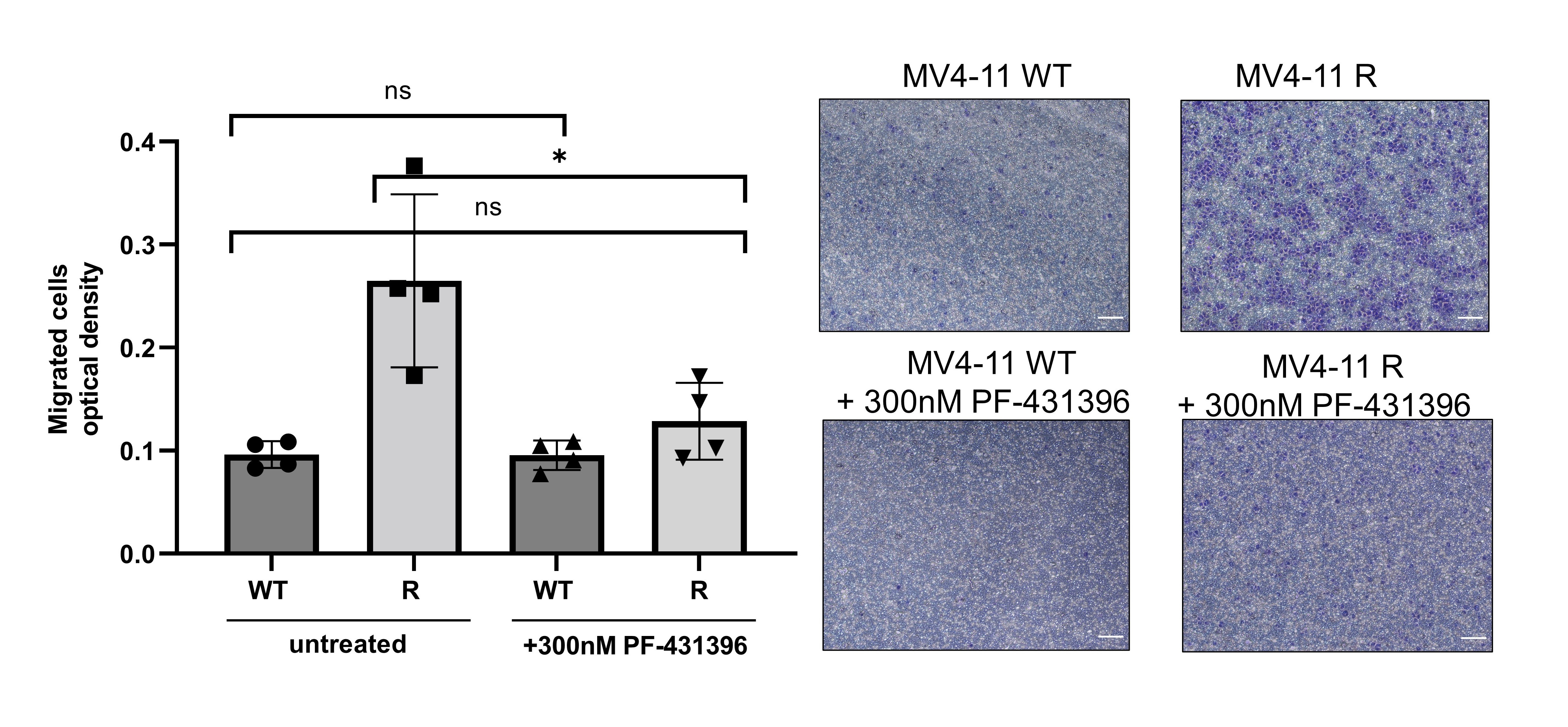 Figure 2: Migration assay of MV4-11 R vs WT treated with and without PF-431396. Treatment was able to revert enhanced migration in resistant cells.