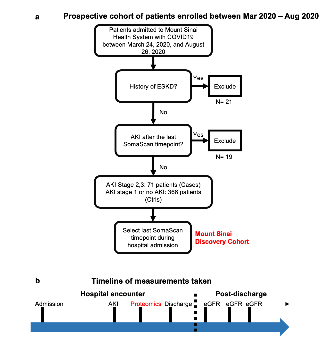 Prior research using minimally invasive proteomics assays has shown the use of peripheral serum as a readily accessible source of proteins that accurately reflects the human disease state30,31,32,33. Proteomic biomarkers have previously shown success in predicting COVID-19 outcomes27,28,29. Therefore, to understand the yet, unclear underlying mechanism that drives AKI in hospitalized, COVID-19 patients who were still alive, we sought to characterize the proteomic changes associated with COVID associated AKI.