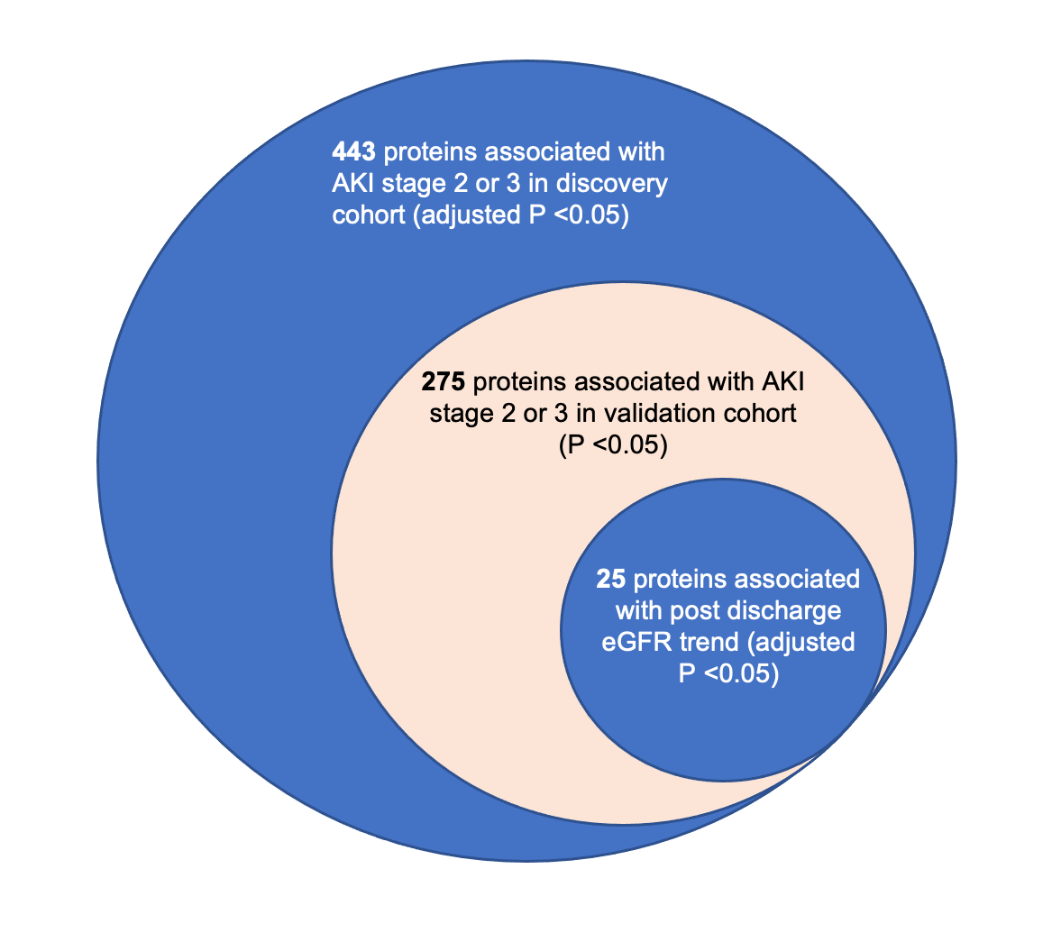 We identified proteins that were significantly different between patients with and without AKI. To determine whether these proteomic perturbations also characterize post-discharge kidney function decline we also correlated these markers with estimated glomerular filtration rate (eGFR) of returning patients post-discharge.
