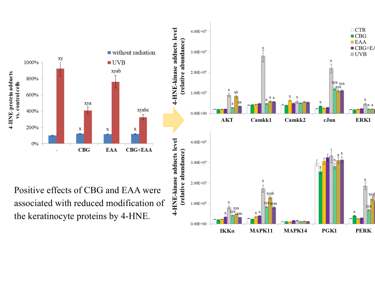 The results obtained allowed conclusion that the antioxidant and protective properties of CBG and EAA favour the reduction of total 4-HNE protein adducts as well as of the 4-HNE kinase adducts, thus effectively influencing the activity of kinases and modifying metabolic pathways in which phosphorylation is of key importance, including Nrf2, AP-1, NFκB. Moreover, CBG and EAA, especially when used together, by maintaining proteome stability and kinase-dependent signalling, may support the restoration of metabolism of human keratinocytes exposed to UVB radiation. The unexpected finding of the differential expression of kinases even 24 hours after treatment might be related to the change of their modifications by 4-HNE, which acts as signalling molecule itself, regulating the growth of the cells, even stimulating proliferation and differentiation, but only if present at low, non-toxic concentrations.