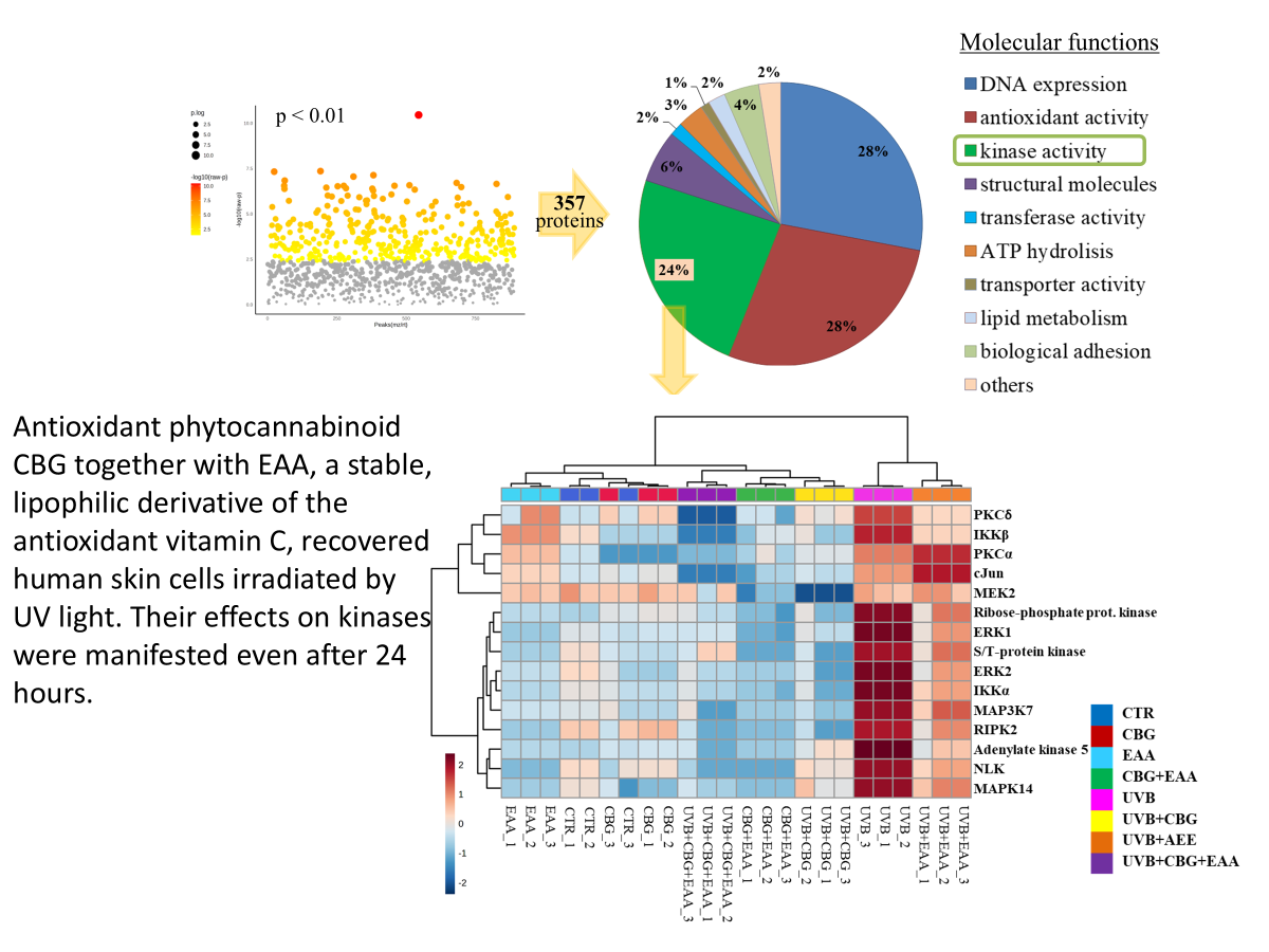 Phytocannabinoid CBG together with EAA, a stable, lipophilic derivative of the vitamin C, recovered human skin cells irradiated by UV light. Their effects on kinases were manifested even after 24 hours.