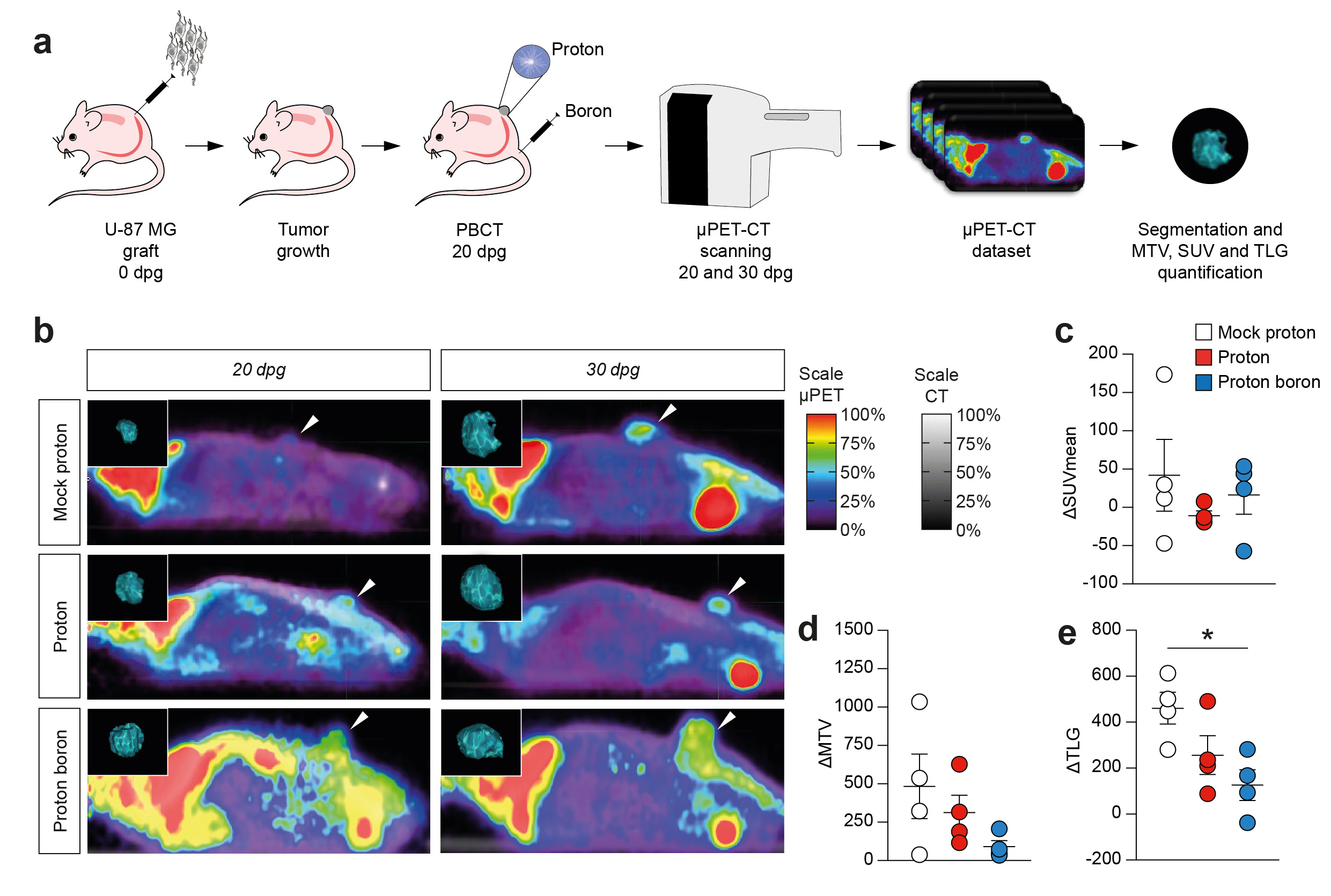 Here we explored the effect of Proton Boron Capture Therapy (PBCT) in a preclinical model GBM. We performed proton irradiation in a heterotopic model of GBM using sub-therapeutic dose of 10 Gy at 20 days post graft (dgp). Proton Boron Capture Therapy (PBCT) mice received a single i.p. injection of boronophenylalanine. Data showed a significant reduction of total lesion glycolysis, assessed using a μ positron emission tomography-computed tomography (μPET-CT) analysis in live imaging. We quantified a clinically scalable PET parameter (i.e. TLG), providing a simultaneous estimation of MTV and SUV for volumetric and metabolic information2. Results suggest a reduction of ΔTLG, indicating a better response in PBCT as compared to control and protons alone.