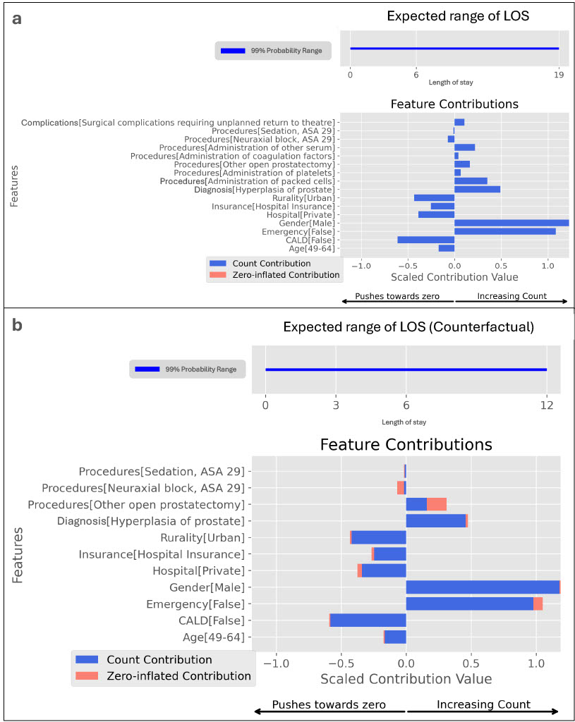 Figure 1: Providing feedback to healthcare professionals via counterfactual analysis. Counterfactual analysis of a patient with surgical complications developed during open prostatectomy for prostate hyperplasia. Figure 1a: Shows the expected range of LOS and the count and zero-inflated parameters that contribute to the overall prediction, given the complications and blood transfusions, the expected LOS within a 99% probability range is predicted to be 0 – 19 days. The feature contribution plot shows that the parameters affecting the overall prediction are mostly count parameters. Figure 1b: Shows the counterfactual analysis of the patient, predicting that the expected range of LOS if the patient did not have complications and blood transfusions. The expected LOS within 99% probability decreases to 0 – 12 days. The feature contribution plot has now changed, with zero-inflated parameters (highlighted in orange) now marginally contributing to the overall prediction.