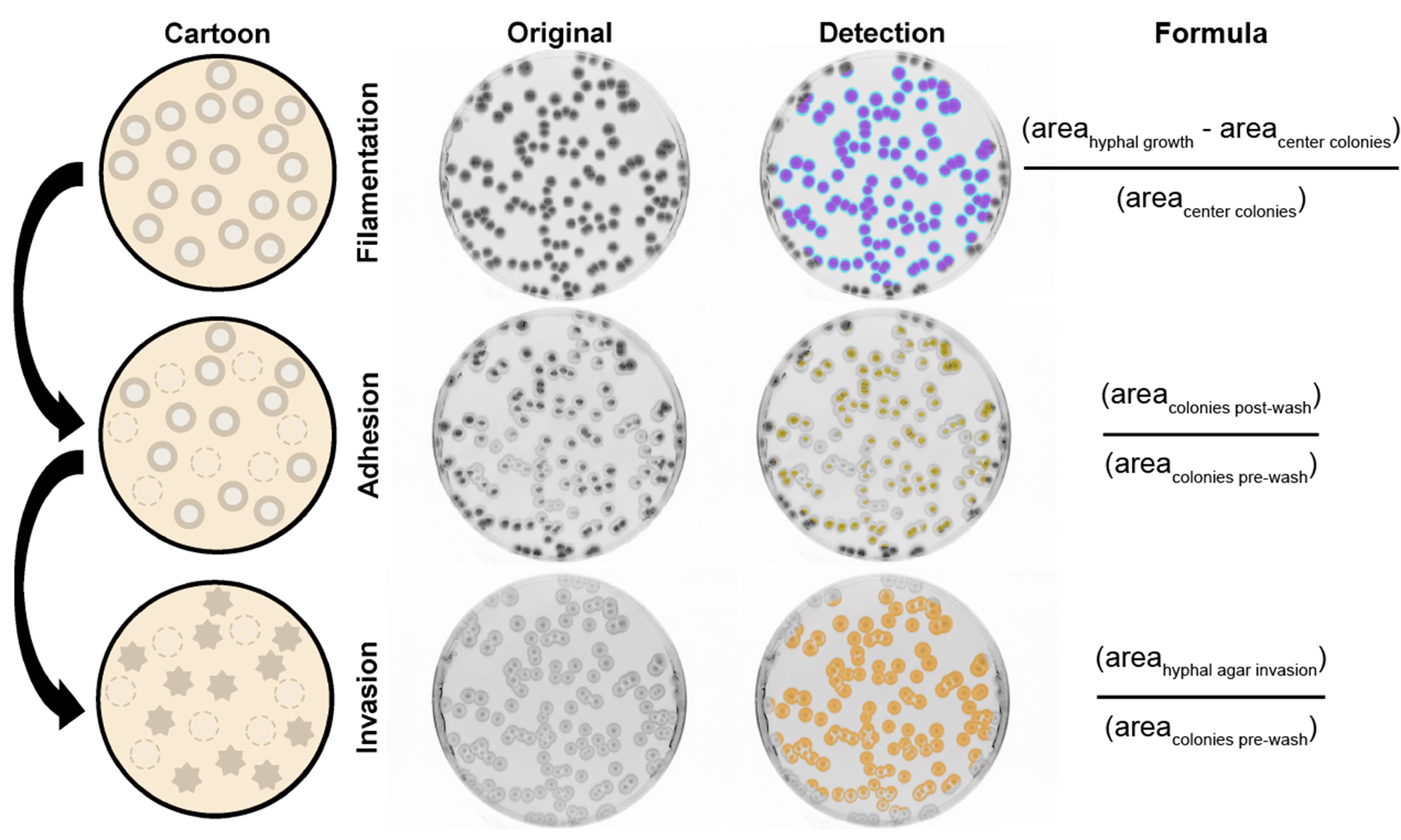 Figure 2. Automated detection of biofilm-related phenotypes in Candida. One hundred cells from each strain were plated, allowed to grow for seven days, and the resulting colonies were imaged for filamentation (radial in cyan and center colony wrinkling in magenta). Plates were then rinsed with a stream of water and imaged for adhesion (yellow). Remaining colonies were wiped off and the plates imaged for agar invasion (orange). A cartoon, raw image, detection overlay, and final formulas developed for scoring (left to right) have been shown to highlight this process. Adapted from Figure 1, Dunn and Fillinger et al. npj Biofilms and Microbiomes. 2020.