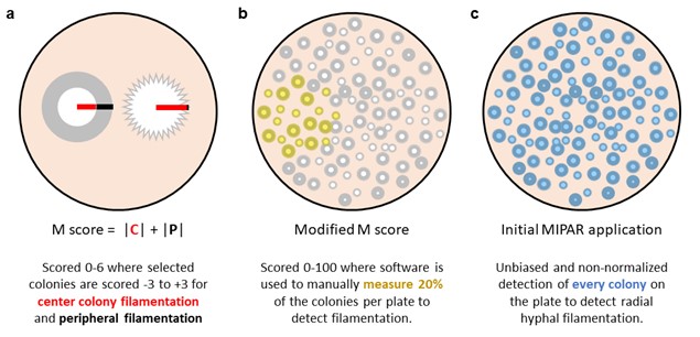 Figure 1. Advancing methods in Candida filamentation measurements. (a) Morphology (M) score measurement of colony filamentation where individual colonies were selected and score by eye based on center colony filamentation and peripheral (radial) filamentation. (b) Modified M score measurements where 20 colonies were measured by pixel length for center colony filamentation and radial filamentation. (c) Application of MIPAR to automatically detect center colony filamentation and radial filamentation for all colonies on the plate.