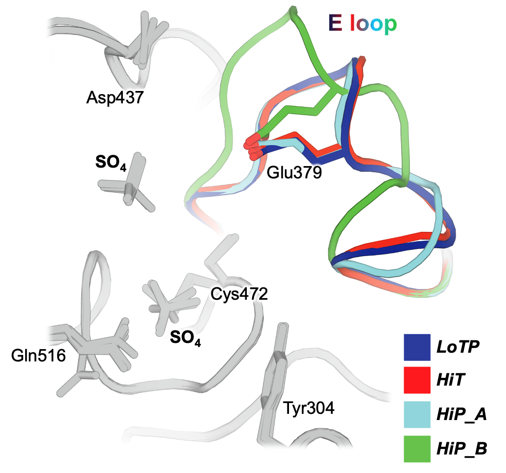 Beyond the E loop, only in the cryogenic and high-pressure datasets do we observe an ordered glycerol molecule is bound near the catalytically key Q loop. By contrast, at high temperature ordered waters are present instead, and this region of the protein undergoes conformational shifts. All three structures are from crystals treated with similar glycerol-containing cryoprotectant solutions, indicating that crystal cryocooling may induce the glycerol to bind, preventing nearby conformations with potential functional relevance seen only at physiological temperature.