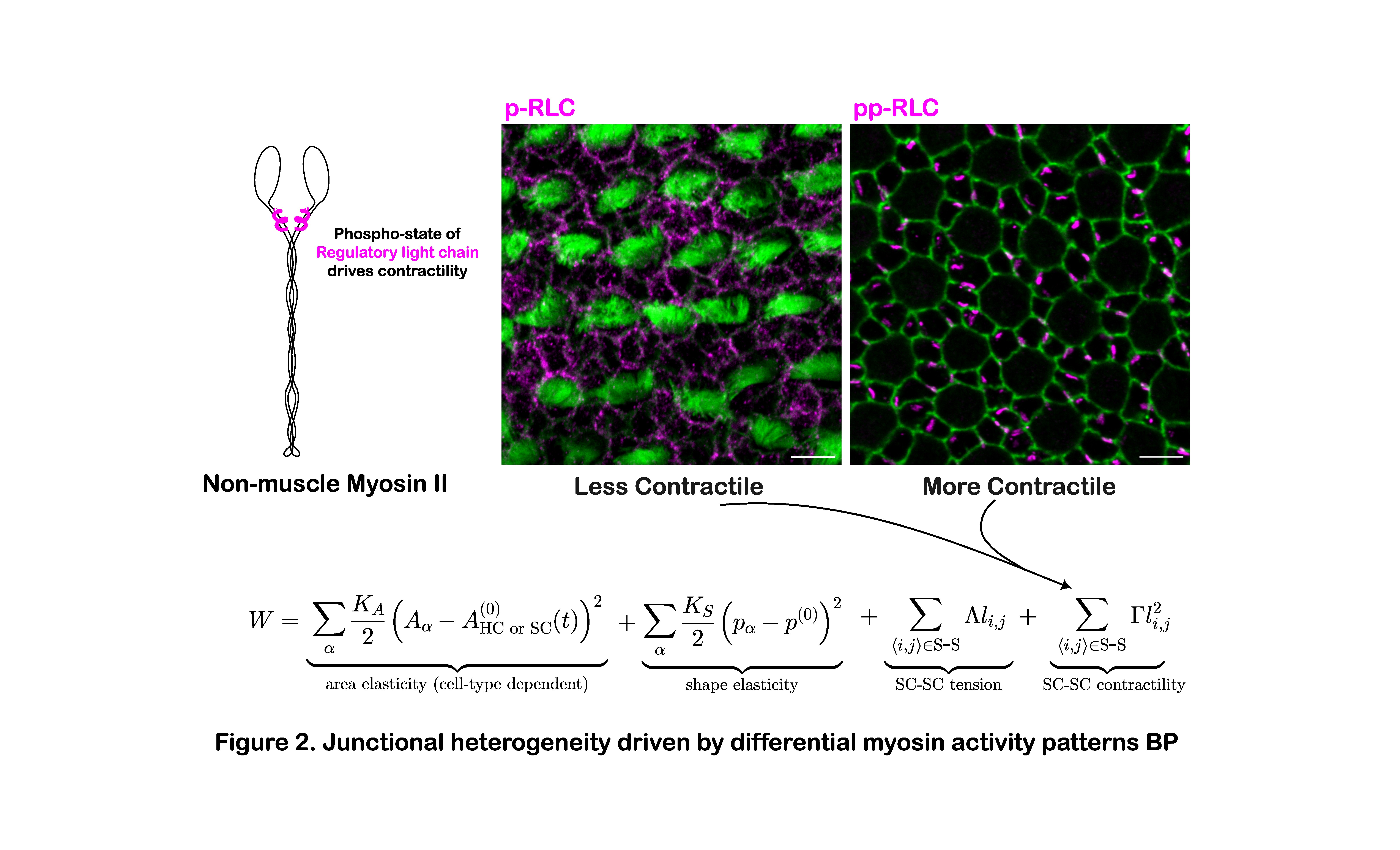 The simultaneous development of spatial and orientational order hinted at a shared underlying mechanism. We grew confident of this link when we disrupted spatial order and also disrupted orientational order. But how to find this common thread? It was intuitive to think in terms of cell neighbours—according to Lewis’ Law; larger cells tend to have more neighbours. However, in the BP, HCs and SCs with the equal surface area had different neighbour counts. This suggested a mechanical difference. Indeed, we discovered that the interface between two SCs was more contractile than between an HC and an SC. These differences were driven by the enrichment of a double-phosphorylated form of non-muscle myosin II (NMII)—essential for maintaining the HC-surrounded-by-SC architecture and, intriguingly, critical for orientational alignment too.