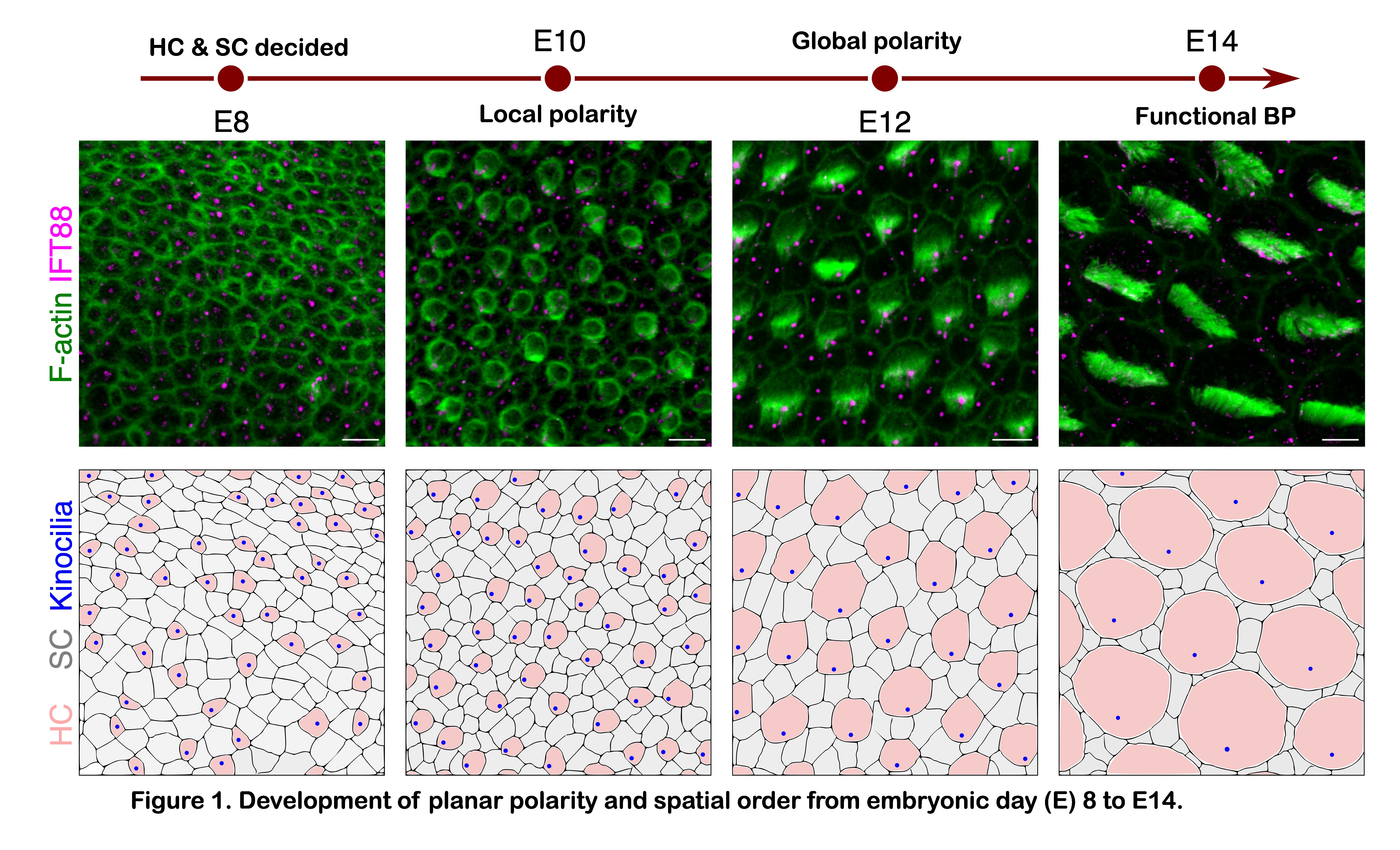 Early on, when the HCs and SCs are first decided, HCs are smaller and surrounded by SC. The protrusions on its apical surface have just begun and the leader of those protrusions, the kinocilia, is in the middle of the apical surface. In the next two days, the kinocilia move to one edge of the cells. To our surprise, this initial movement to an edge was locally coordinated such that HCs on the one side (proximal) of the tissue had kinocilia on the proximal edge while the other side of the BP (distal) had kinocilia on the proximal edge. Over the next two days, these protrusions aligned across the epithelium in a single, unified direction, optimising sensitivity to sound. During this four-day developmental window, other dramatic changes occurred: HCs grew larger, and the BP itself elongated to twice its original length. However, even amidst this cellular turmoil, both HCs and SCs maintained a pattern where HCs were always surrounded by SCs. It was during this dynamic transformation, the twofold organisation of the BP—spatial and orientational—emerged in concert (Figure 1).