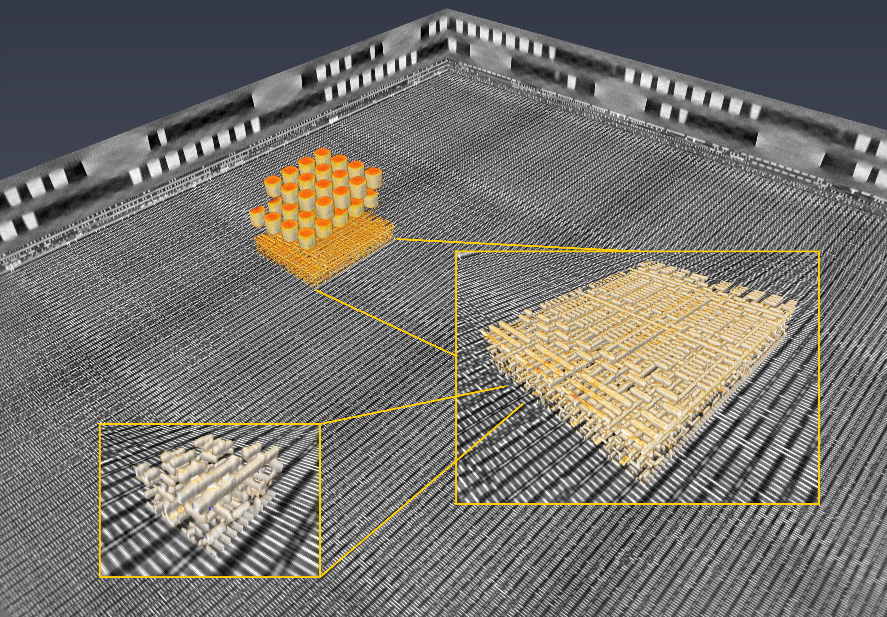 Fig. 1 Artistic image showing in grayscale a 3D virtual slices representation of the chip. The lowest layer is visible as well as the stacking of the layers to larger structures. In color a 3D volume rendering is shown at various magnification. The resolution of the dataset is 18.9 nm.
