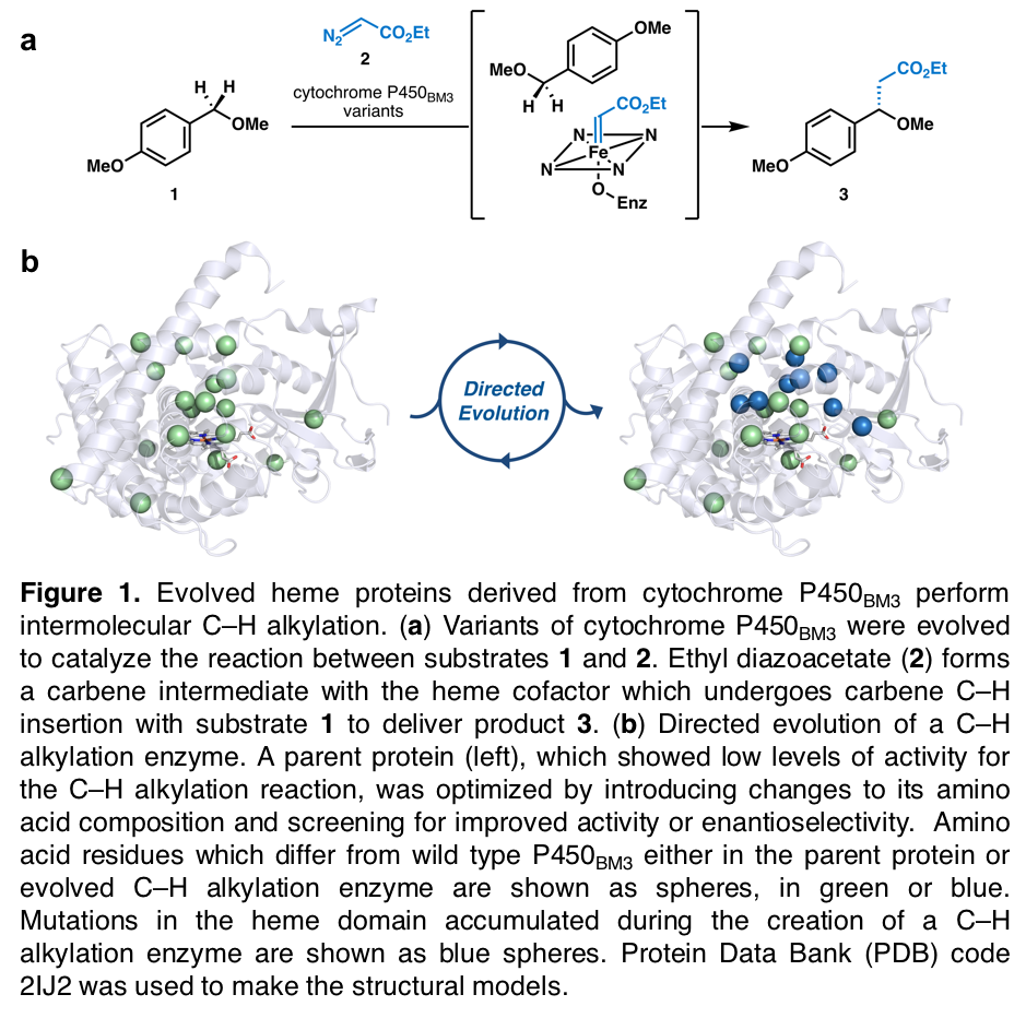 One transformation which captured our interest was the transformation of a sp3-hybridized carbon–hydrogen (C–H) bond to a carbon–carbon (C–C) bond. Since C–H bonds are ubiquitous in organic molecules, methods which selectively alkylate a C–H bond provide an elegant strategy for chemical synthesis. While a few natural enzymes have evolved to perform this transformation on certain metabolites (e.g. some radical SAM enzymes), we were impressed with a strategy developed by organic chemists, carbene C–H insertion, due to its demonstrated versatility. Carbene C–H insertion is not a known mechanism of any natural enzyme and we were curious as to whether a natural enzyme could be altered to adopt this function.