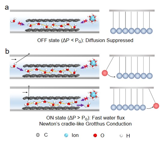 In order to theoretically reveal the new gating mechanism, we performed in-situ Fourier-transform infrared spectroscopy (in-situ FTIR) and found that H-bonded water network formed within the atomic-scale graphene capillaries is stronger than that in the liquid water. First principles/molecular dynamics (MD) simulation calculation shows that the strong H-bonded water network is in the form of 2D crystal-like water nanosheets. With this structure in the highly-confined space, the whole water-intercalated graphene capillary becomes a solid, suppressing water and ion diffusion in “OFF” state (Fig. 3a). When applying a hydrostatic pressure in the “ON” state, a shear force will be applied onto the ordered water nanosheet, and the water transport mechanism is by analogy with high-speed, diffusion-free Newton’s cradle-like Grotthus conduction (Fig. 3b). In this way, a new water molecular gating mechanism has been established for the anomalous permeation behavior being observed in this work.
